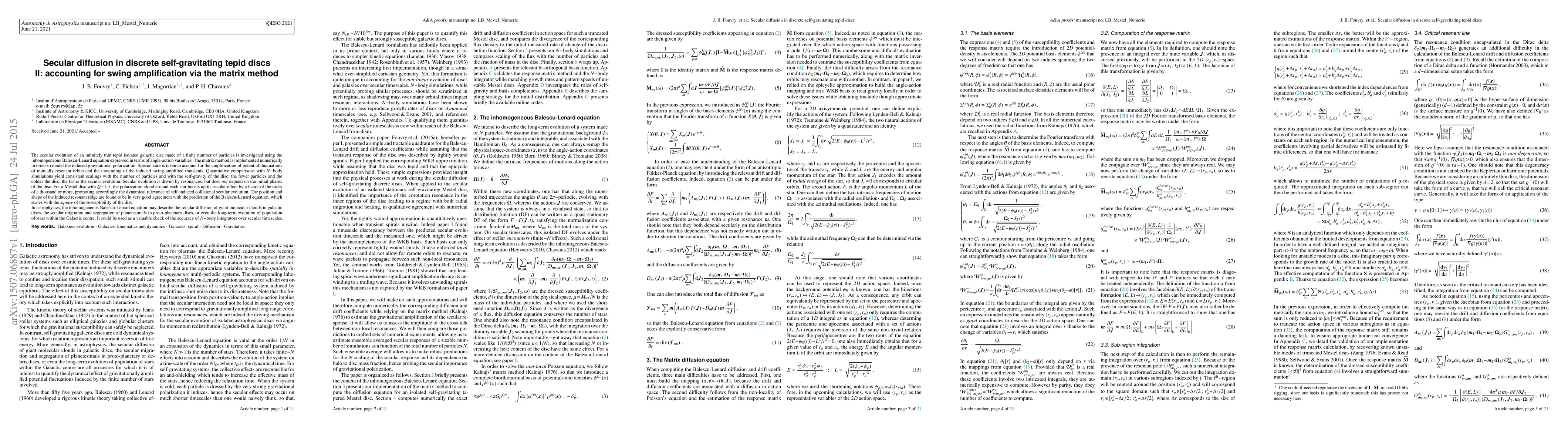 This paper investigates the secular evolution of self-gravitating tepid discs using the matrix method to model gravitational polarization and swing amplification. It finds that fewer particles and colder discs lead to faster secular evolution, driven by resonances, and validates the Balescu-Lenard equation's predictions for induced resonant ridges.