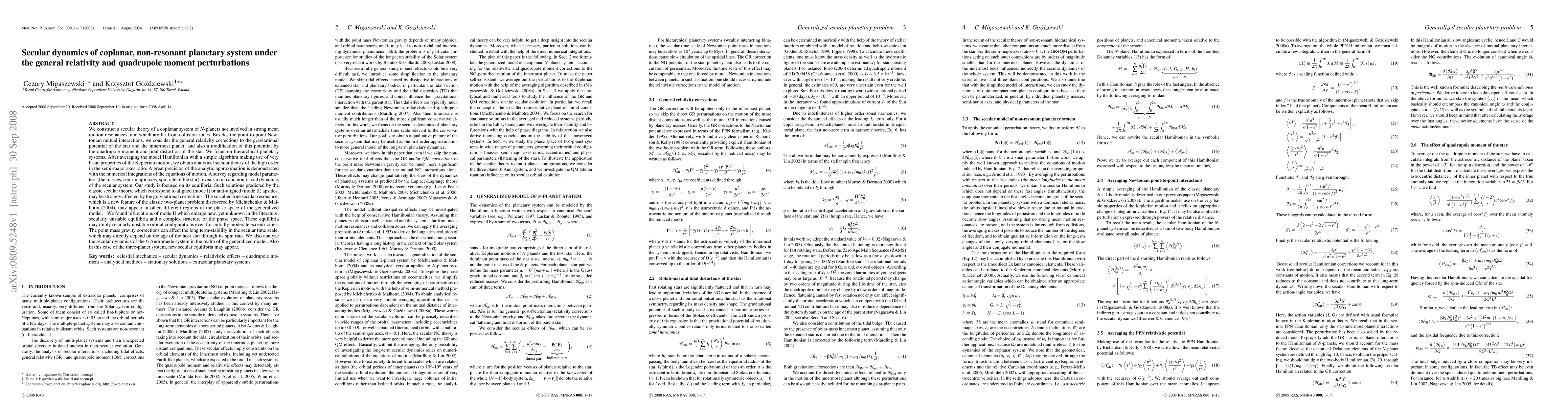 This paper develops a secular theory for a coplanar, non-resonant planetary system, incorporating general relativity and quadrupole moment perturbations. It reveals complex dynamics and new secular equilibria, potentially destabilizing initially moderate eccentricities, and applies the model to the upsilon Andromede system.