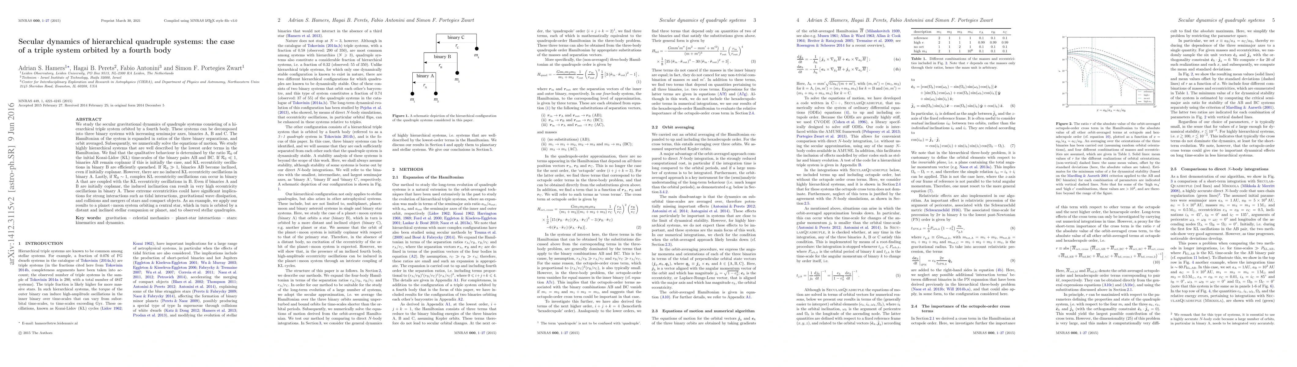 This study explores the long-term gravitational dynamics of quadruple systems, consisting of a triple system orbited by a fourth body. Using Hamiltonian expansion and numerical solutions, it finds that the behavior is primarily governed by the ratio of initial Kozai-Lidov time-scales of binary pairs. Depending on this ratio, the system may exhibit coplanar or inclined binaries, with potential for high eccentricity oscillations affecting stellar interactions, gravitational waves, and collisions. The research applies findings to planet-moon systems and observed stellar quadruples.
