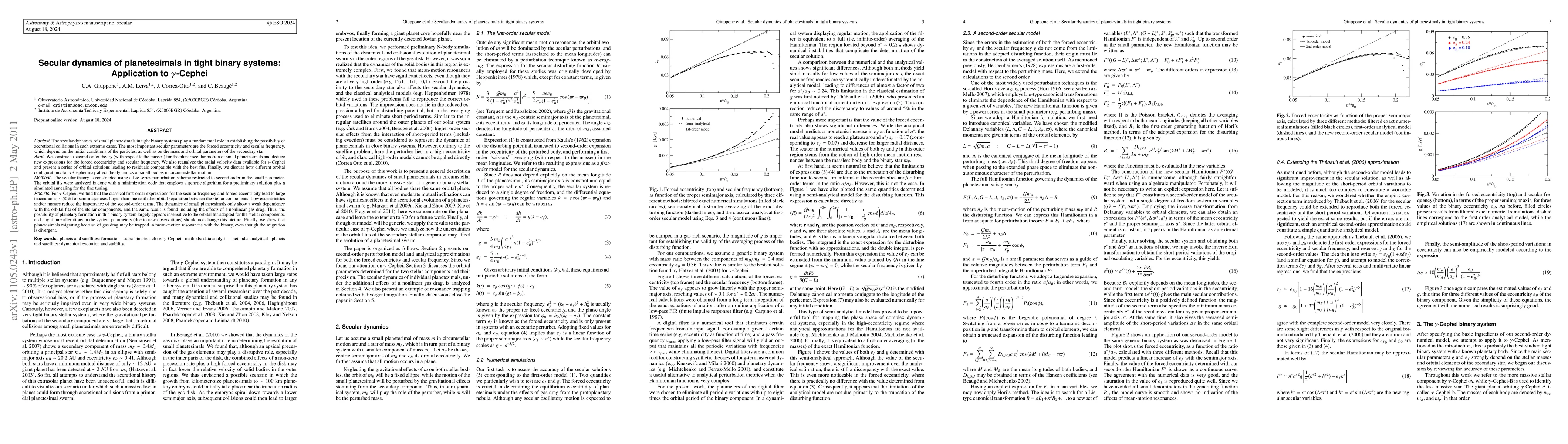 The secular dynamics of small planetesimals in tight binary systems play a fundamental role in establishing the possibility of accretional collisions in such extreme cases. The most important secular parameters are the forced eccentricity and secular frequency, which depend on the initial conditions of the particles, as well as on the mass and orbital parameters of the secondary star. We construct a second-order theory (with respect to the masses) for the planar secular motion of small planetasimals and deduce new expressions for the forced eccentricity and secular frequency. We also reanalyze the radial velocity data available for Gamma-Cephei and present a series of orbital solutions leading to residuals compatible with the best fits. Finally, we discuss how different orbital configurations for Gamma-Cephei may affect the dynamics of small bodies in circunmstellar motion. For Gamma-Cephei, we find that the classical first-order expressions for the secular frequency and forced eccentricity lead to large inaccuracies around 50 % for semimajor axes larger than one tenth the orbital separation between the stellar components. Low eccentricities and/or masses reduce the importance of the second-order terms. The dynamics of small planetesimals only show a weak dependence with the orbital fits of the stellar components, and the same result is found including the effects of a nonlinear gas drag. Thus, the possibility of planetary formation in this binary system largely appears insensitive to the orbital fits adopted for the stellar components, and any future alterations in the system parameters (due to new observations) should not change this picture. Finally, we show that planetesimals migrating because of gas drag may be trapped in mean-motion resonances with the binary, even though the migration is divergent.