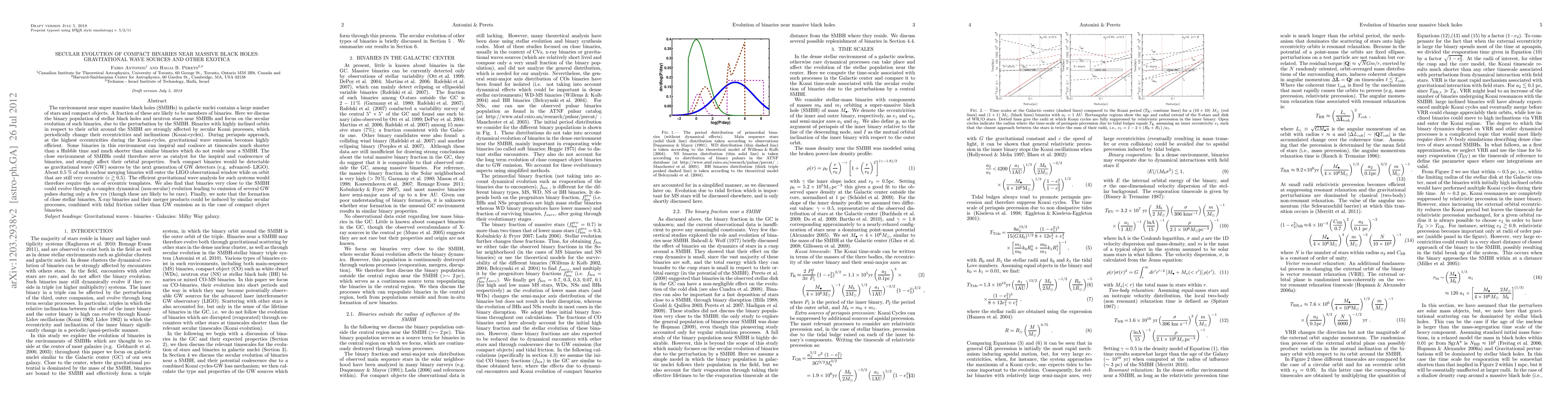 This paper investigates the secular evolution of compact binaries near supermassive black holes (SMBHs) in galactic nuclei, focusing on gravitational wave sources due to their perturbed orbits. The study highlights that binaries in highly inclined orbits undergo Kozai cycles, leading to efficient gravitational wave emission during periapsis, and some may coalesce much faster than similar binaries elsewhere. These binaries could be detected by future gravitational wave observatories, with 0.5% entering the LIGO observational window while still eccentric.