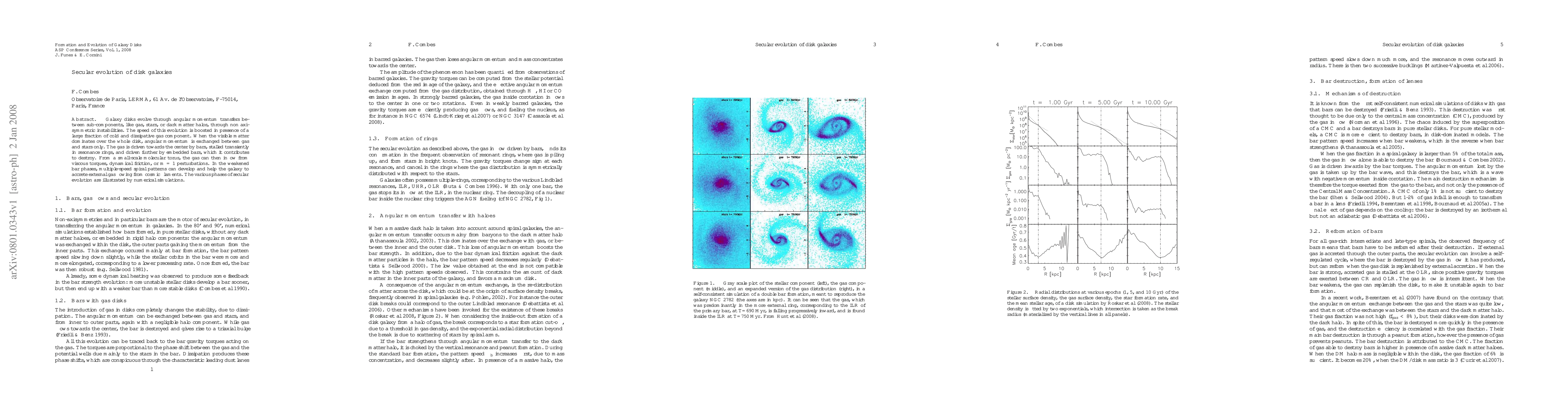 Galaxy disks evolve through angular momentum transfers between gas, stars, and dark matter halos, driven by the presence of cold and dissipative gas. Numerical simulations illustrate various phases of secular evolution, including bar-driven gas flow and accretion of external gas from cosmic filaments.