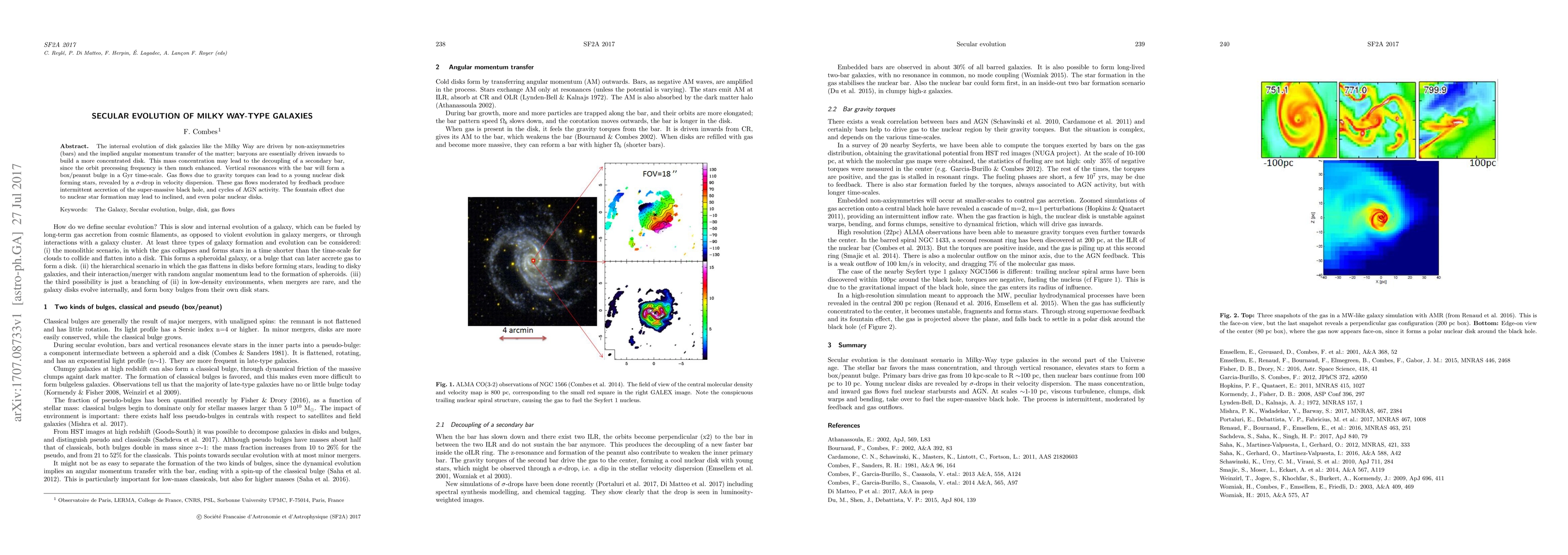 The internal evolution of disk galaxies like the Milky Way are driven by non-axisymmetries (bars) and the implied angular momentum transfer of the matter; baryons are essentially driven inwards to build a more concentrated disk. This mass concentration may lead to the decoupling of a secondary bar, since the orbit precessing frequency is then much enhanced. Vertical resonances with the bar will form a box/peanut bulge in a Gyr time-scale. Gas flows due to gravity torques can lead to a young nuclear disk forming stars, revealed by a sigma-drop in velocity dispersion. These gas flows moderated by feedback produce intermittent accretion of the super-massive black hole, and cycles of AGN activity. The fountain effect due to nuclear star formation may lead to inclined, and even polar nuclear disks.