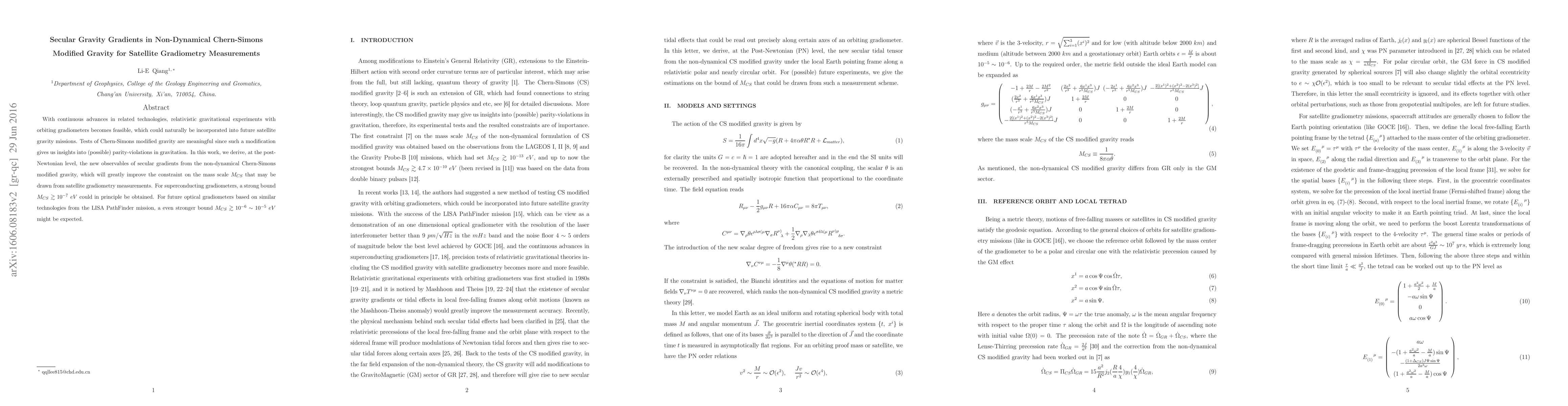 With continuous advances in related technologies, relativistic gravitational experiments with orbiting gradiometers becomes feasible, which could naturally be incorporated into future satellite gravity missions. Tests of Chern-Simons modified gravity are meaningful since such a modification gives us insights into (possible) parity-violations in gravitation. In this work, we derive, at the post-Newtonian level, the new observables of secular gradients from the non-dynamical Chern-Simons modified gravity, which will greatly improve the constraint on the mass scale $M_{CS}$ that may be drawn from satellite gradiometry measurements. For superconducting gradiometers, a strong bound $M_{CS}\geq 10^{-7}\ eV$ could in principle be obtained. For future optical gradiometers based on similar technologies from the LISA PathFinder mission, a even stronger bound $M_{CS}\geq 10^{-6}\sim 10^{-5}\ eV$ might be expected.