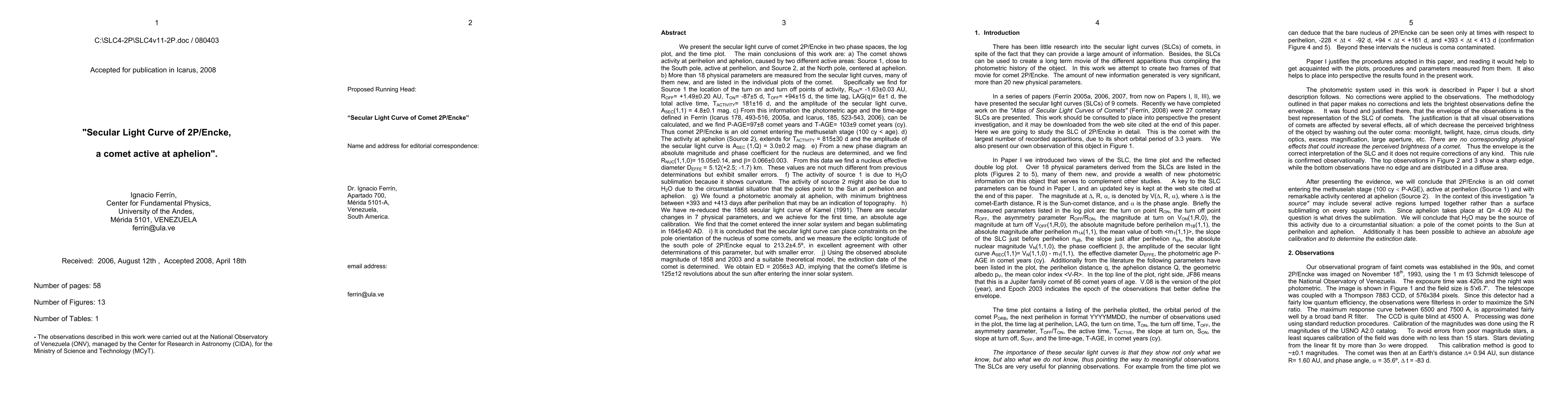 We present the secular light curve of comet 2P/Encke in two phase spaces, the log plot, and the time plot. The main conclusions of this work are: a) The comet shows activity at perihelion and aphelion, caused by two different active areas: Source 1, close to the South pole, active at perihelion, and Source 2, at the North pole, centered at aphelion. b) More than 18 physical parameters are measured from the secular light curves, many of them new, and are listed in the individual plots of the comet. Specifically we find for Source 1 the location of the turn on and turn off points of activity, RON= -1.63+-0.03 AU, ROFF= +1.49+-0.20 AU, TON= -87+-5 d, TOFF= +94+-15 d, the time lag, LAG(q)= 6+-1 d, the total active time, TACTIVITY= 181+-16 d, and the amplitude of the secular light curve, ASEC(1,1) = 4.8+-0.1 mag. c) From this information the photometric age and the time-age defined in Ferrin (Icarus 178, 493-516, 2005a, and Icarus, 185, 523-543, 2006), can be calculated, and we find P-AGE=97+-8 comet years and T-AGE= 103+-9 comet years (cy). Thus comet 2P/Encke is an old comet entering the methuselah stage (100 cy < age). d) The activity at aphelion (Source 2), extends for TACTIVITY = 815+-30 d and the amplitude of the secular light curve is ASEC (1,Q) = 3.0+-0.2 mag. e) From a new phase diagram an absolute magnitude and phase coefficient for the nucleus are determined, and we find RNUC(1,1,0)= 15.05+-0.14, and betha= 0.066+-0.003. From this data we find a nucleus effective diameter DEFFE = 5.12(+2.5;-1.7) km. These values are not much different from previous determinations but exhibit smaller errors. Additional results appear in the full abstract.