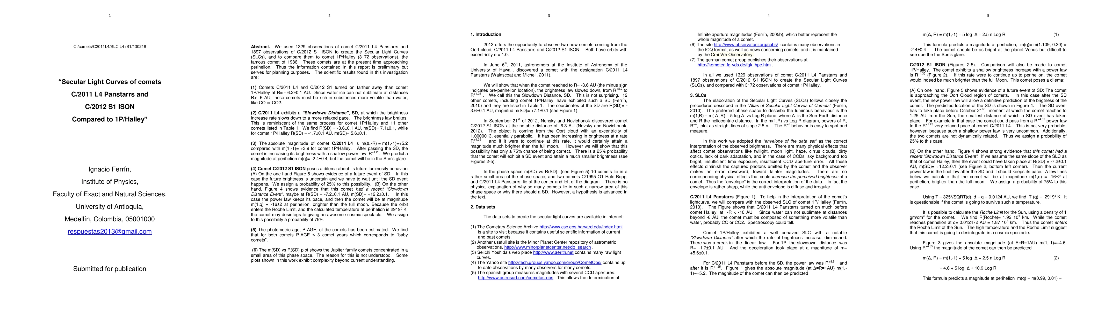 This study compares the Secular Light Curves of comets C/2011 L4 Panstarrs and C/2012 S1 ISON, derived from 1329 and 1897 observations respectively, to those of comet 1P/Halley (3172 observations). The preliminary findings are based on the comets approaching perihelion.
