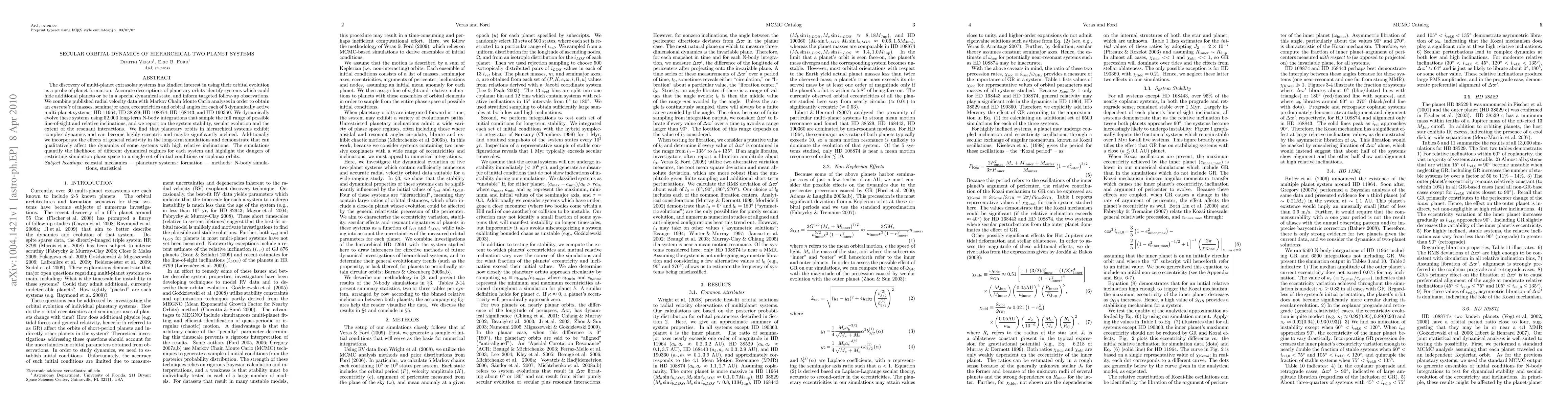 The discovery of multi-planet extrasolar systems has kindled interest in using their orbital evolution as a probe of planet formation. Accurate descriptions of planetary orbits identify systems which could hide additional planets or be in a special dynamical state, and inform targeted follow-up observations. We combine published radial velocity data with Markov Chain Monte Carlo analyses in order to obtain an ensemble of masses, semimajor axes, eccentricities and orbital angles for each of 5 dynamically active multi-planet systems: HD 11964, HD 38529, HD 108874, HD 168443, and HD 190360. We dynamically evolve these systems using 52,000 long-term N-body integrations that sample the full range of possible line-of-sight and relative inclinations, and we report on the system stability, secular evolution and the extent of the resonant interactions. We find that planetary orbits in hierarchical systems exhibit complex dynamics and can become highly eccentric and maybe significantly inclined. Additionally we incorporate the effects of general relativity in the long-term simulations and demonstrate that can qualitatively affect the dynamics of some systems with high relative inclinations. The simulations quantify the likelihood of different dynamical regimes for each system and highlight the dangers of restricting simulation phase space to a single set of initial conditions or coplanar orbits.