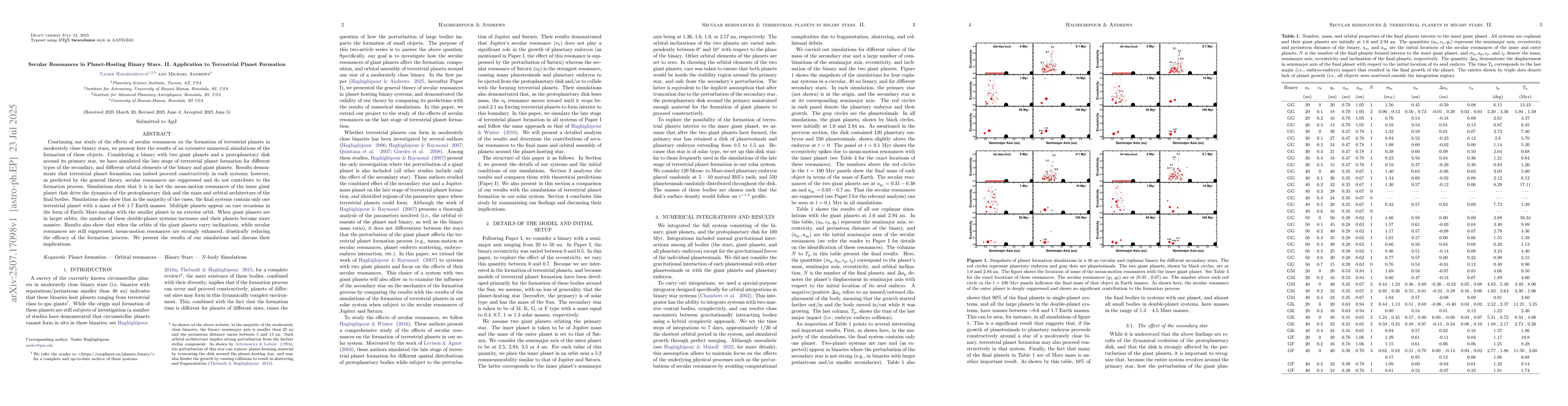 Continuing our study of the effects of secular resonances on the formation of terrestrial planets in moderately close binary stars, we present here the results of an extensive numerical simulations of the formation of these objects. Considering a binary with two giant planets and a protoplanetary disk around its primary star, we have simulated the late stage of terrestrial planet formation for different types of the secondary, and different orbital elements of the binary and giant planets. Results demonstrate that terrestrial planet formation can indeed proceed constructively in such systems; however, as predicted by the general theory, secular resonances are suppressed and do not contribute to the formation process. Simulations show that it is in fact the mean-motion resonances of the inner giant planet that drive the dynamics of the protoplanetary disk and the mass and orbital architecture of the final bodies. Simulations also show that in the majority of the cases, the final systems contain only one terrestrial planet with a mass of 0.6-1.7 Earth masses. Multiple planets appear on rare occasions in the form of Earth-Mars analogs with the smaller planet in an exterior orbit. When giant planets are in larger orbits, the number of these double-planet systems increases and their planets become more massive. Results also show that when the orbits of the giant planets carry inclinations, while secular resonances are still suppressed, mean-motion resonances are strongly enhanced, drastically reducing the efficacy of the formation process. We present the results of our simulations and discuss their implications.
