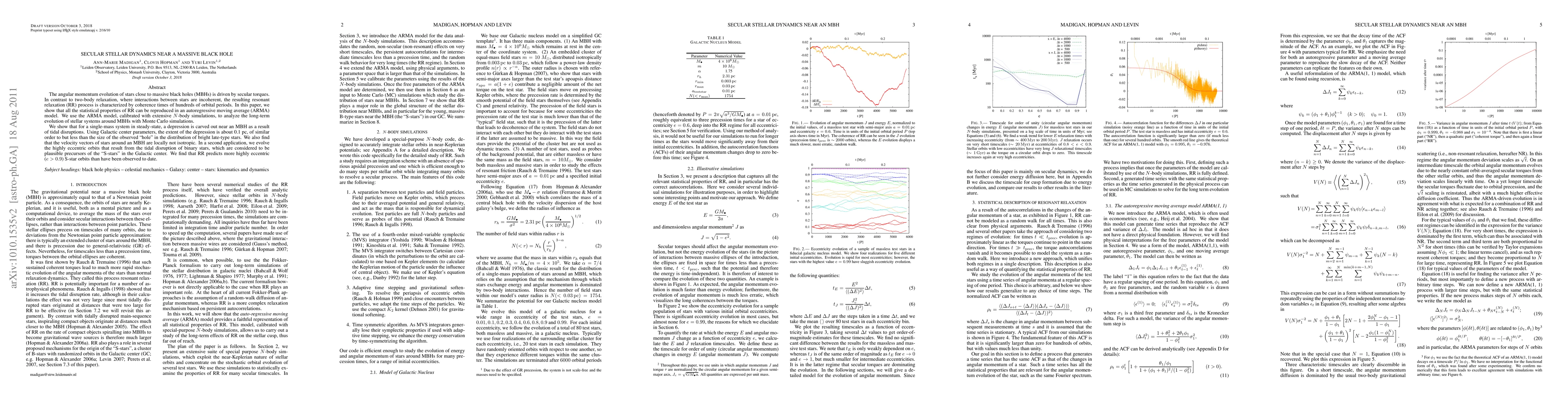 This paper investigates the angular momentum evolution of stars near massive black holes driven by resonant relaxation, using an ARMA model calibrated with N-body simulations. It finds that tidal disruptions create a depression in stellar distribution around the black hole, and predicts more highly eccentric orbits for S-stars than currently observed.