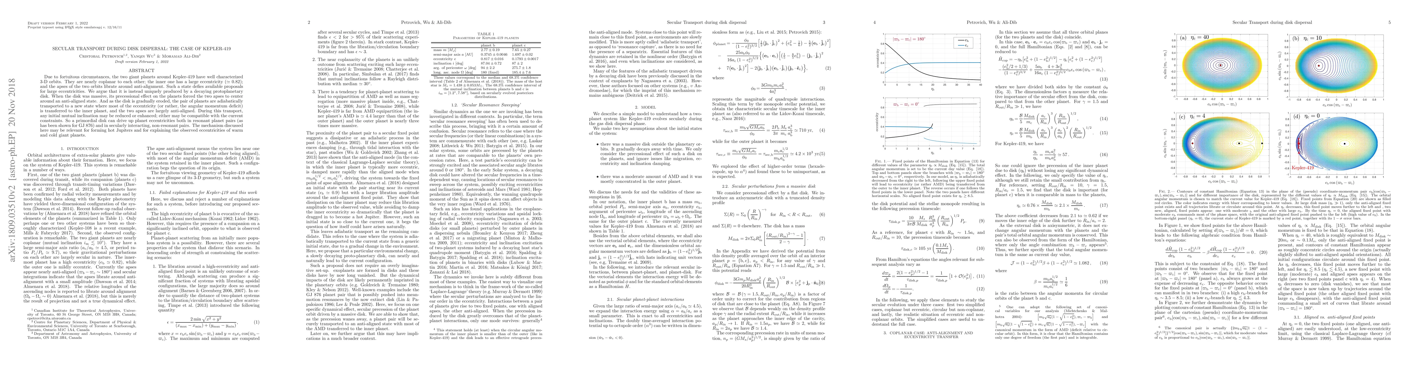 Due to fortuitous circumstances, the two giant planets around Kepler-419 have well characterized 3-D orbits. They are nearly coplanar to each other; the inner one has a large eccentricity (~0.82); and the apses of the two orbits librate around anti-alignment. Such a state defies available proposals for large eccentricities. We argue that it is instead uniquely produced by a decaying protoplanetary disk. When the disk was massive, its precessional effect on the planets forced the two apses to center around an anti-aligned state. And as the disk is gradually eroded, the pair of planets are adiabatically transported to a new state where most of the eccentricity (or rather, the angular momentum deficit) is transferred to the inner planet, and the two apses are largely anti-aligned. During this transport, any initial mutual inclination may be reduced or enhanced; either may be compatible with the current constraints. So a primordial disk can drive up planet eccentricities both in resonant planet pairs (as has been shown for GJ 876) and in secularly interacting, non-resonant pairs. The mechanism discussed here may be relevant for forming hot Jupiters and for explaining the observed eccentricities of warm and cold giant planets.