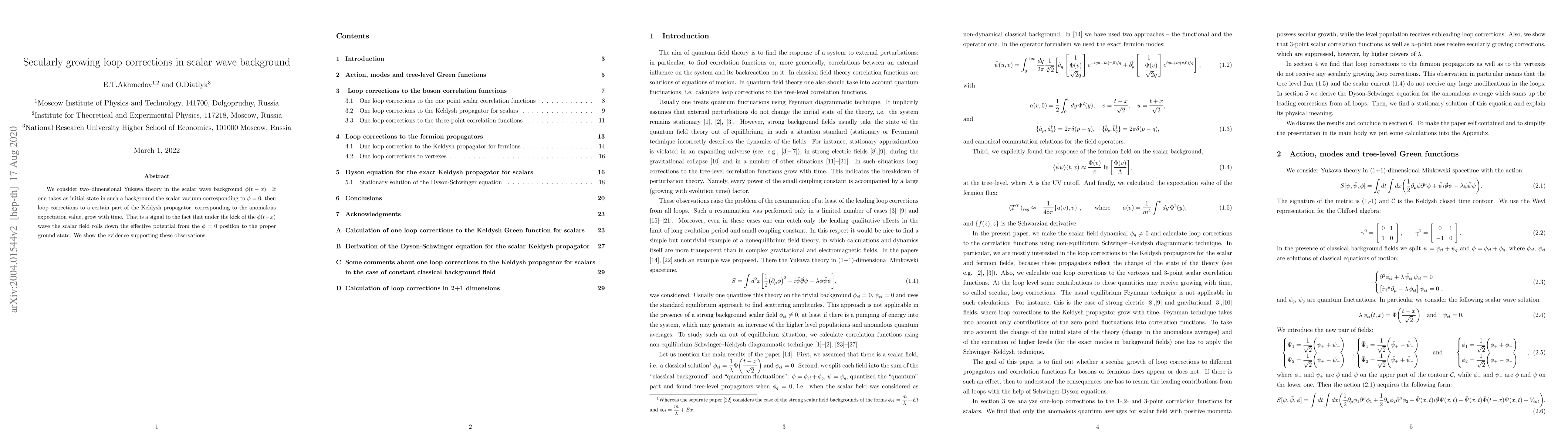 This paper investigates two-dimensional Yukawa theory in a scalar wave background $\phi(t-x)$, demonstrating that loop corrections to the Keldysh propagator grow secularly over time, indicating the scalar field's evolution from $\phi=0$ to its proper ground state under the influence of the wave. Evidence supporting this temporal growth in loop corrections is provided.