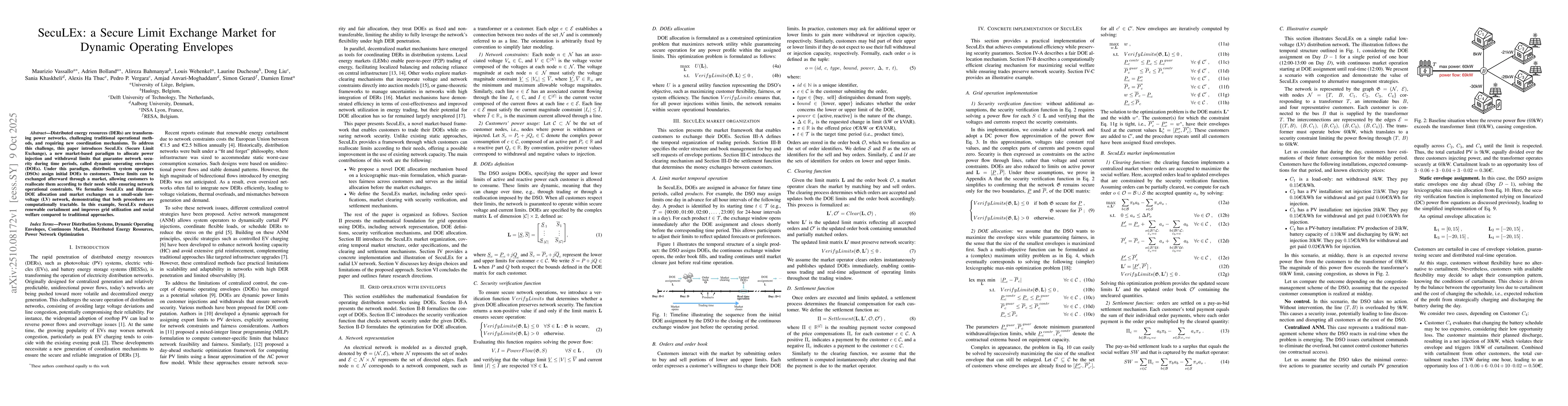 The research introduces SecuLEx, a market-based paradigm for allocating dynamic operating envelopes (DOEs) to ensure network security. It combines DC power flow assumptions with optimization techniques to model DOE allocation and market-clearing processes, validated through a low-voltage distribution network example.