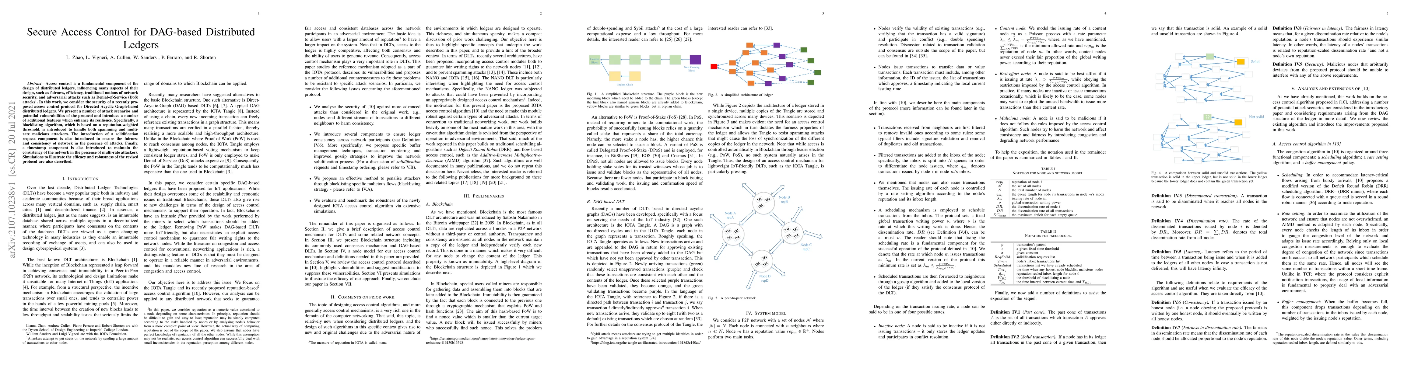 Access control is a fundamental component of the design of distributed ledgers, influencing many aspects of their design, such as fairness, efficiency, traditional notions of network security, and adversarial attacks such as Denial-of-Service (DoS) attacks. In this work, we consider the security of a recently proposed access control protocol for Directed Acyclic Graph-based distributed ledgers. We present a number of attack scenarios and potential vulnerabilities of the protocol and introduce a number of additional features which enhance its resilience. Specifically, a blacklisting algorithm, which is based on a reputation-weighted threshold, is introduced to handle both spamming and multi-rate malicious attackers. The introduction of a solidification request component is also introduced to ensure the fairness and consistency of network in the presence of attacks. Finally, a timestamp component is also introduced to maintain the consistency of the network in the presence of multi-rate attackers. Simulations to illustrate the efficacy and robustness of the revised protocol are also described.