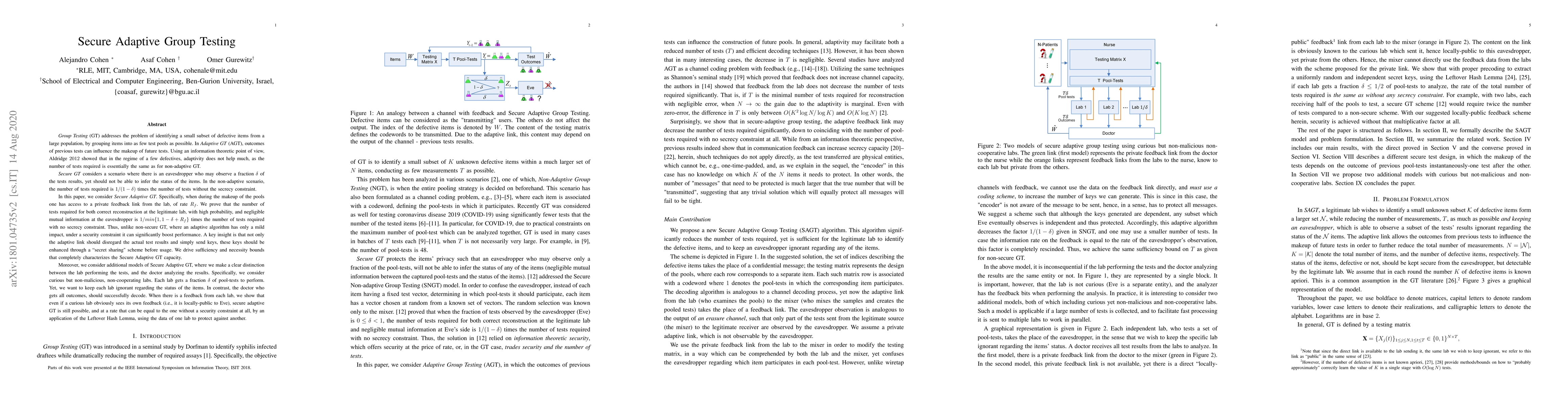 This paper introduces Secure Adaptive Group Testing, which improves performance under a security constraint, allowing adaptive algorithms to significantly boost efficiency while maintaining secrecy. The proposed method involves using secret sharing schemes to enhance keys sent through the feedback link.