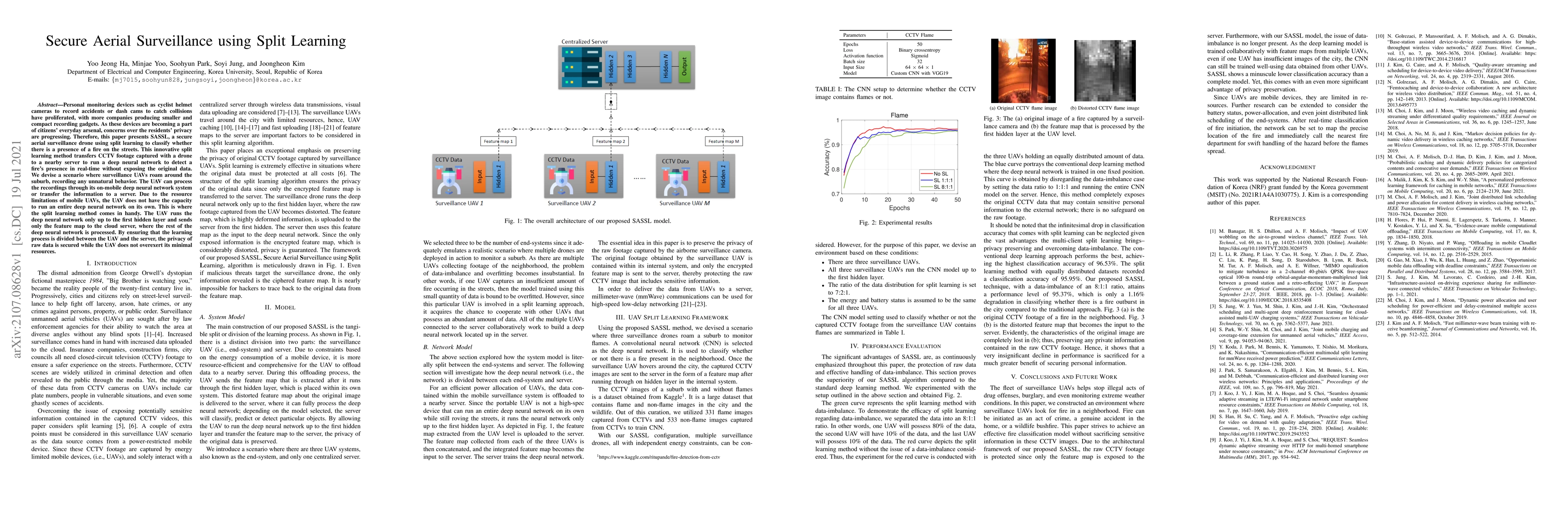 This paper introduces SASSL, a secure aerial surveillance drone using split learning to classify fires in real-time while protecting citizens' privacy. The UAV processes only the first hidden layer of the deep neural network on its own, sending feature maps to a cloud server for further processing.