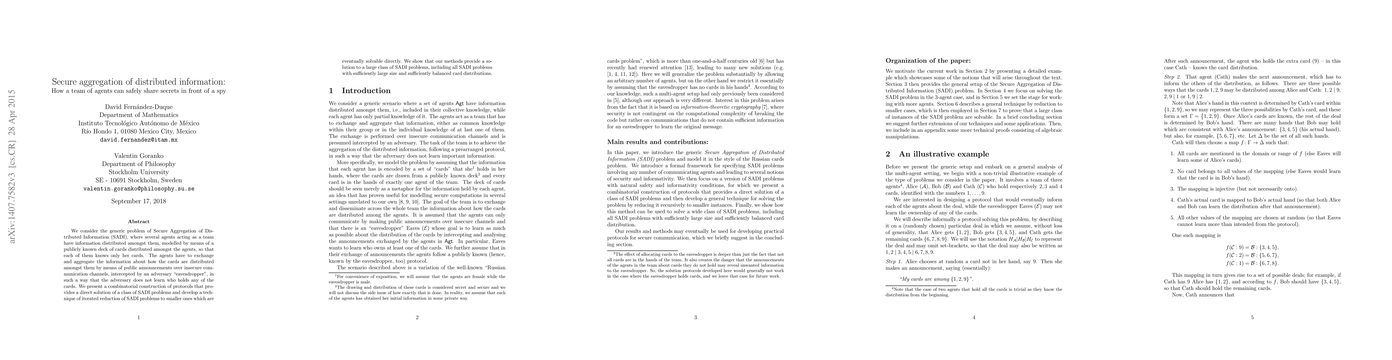 This paper presents combinatorial protocols for Secure Aggregation of Distributed Information (SADI), enabling agents to share and aggregate information securely despite an eavesdropping adversary. The authors develop a reduction technique to solve a broad class of SADI problems, demonstrating effectiveness for large and balanced card distributions.