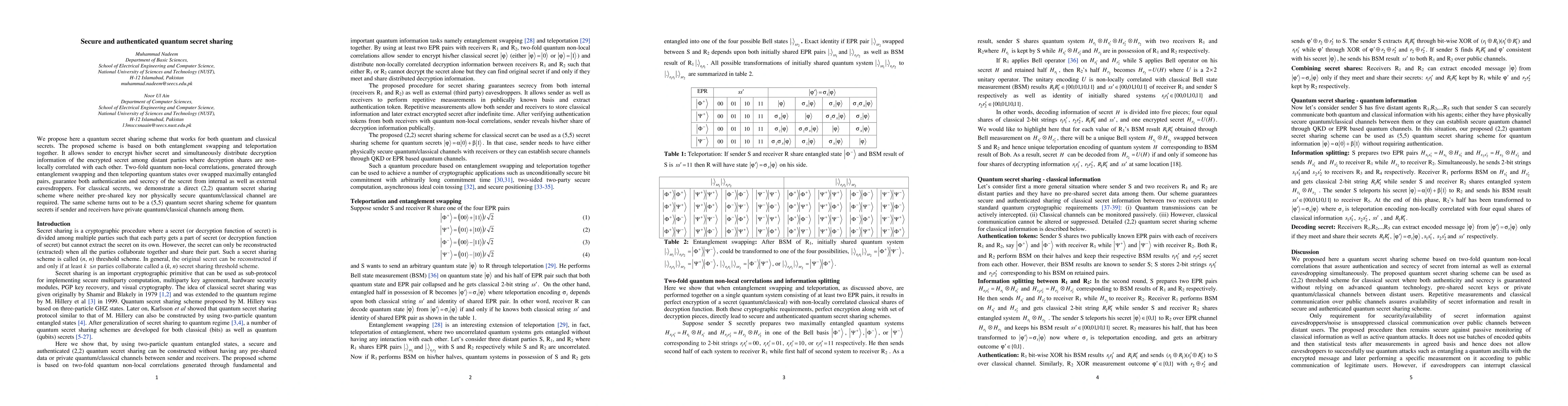 This paper proposes a quantum secret sharing scheme that securely distributes quantum and classical secrets using entanglement swapping and teleportation, ensuring authentication and secrecy through quantum non-local correlations. For classical secrets, it presents a (2,2) scheme without pre-shared keys, while for quantum secrets, it extends to a (5,5) scheme with private quantum/classical channels.
