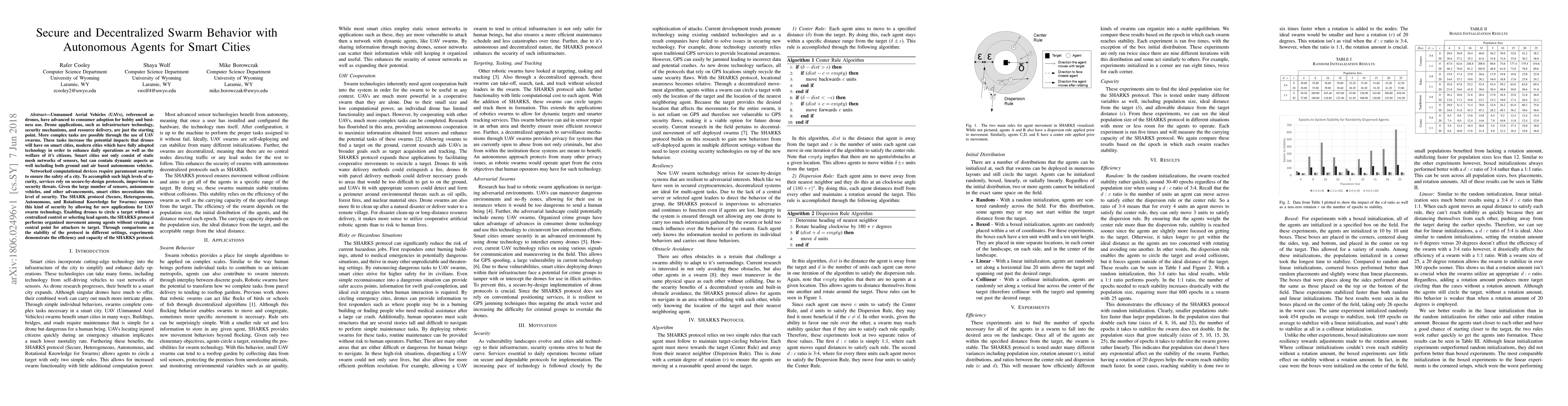 Unmanned Aerial Vehicles (UAVs), referenced as drones, have advanced to consumer adoption for hobby and business use. Drone applications, such as infrastructure technology, security mechanisms, and resource delivery, are just the starting point. More complex tasks are possible through the use of UAV swarms. These tasks increase the potential impacts that drones will have on smart cities, modern cities which have fully adopted technology in order to enhance daily operations as well as the welfare of it's citizens. Smart cities not only consist of static mesh networks of sensors, but can contain dynamic aspects as well including both ground and air based autonomous vehicles. Networked computational devices require paramount security to ensure the safety of a city. To accomplish such high levels of security, services rely on secure-by-design protocols, impervious to security threats. Given the large number of sensors, autonomous vehicles, and other advancements, smart cities necessitates this level of security. The SHARK protocol (Secure, Heterogeneous, Autonomous, and Rotational Knowledge for Swarms) ensures this kind of security by allowing for new applications for UAV swarm technology. Enabling drones to circle a target without a centralized control or selecting lead agents, the SHARKS protocol performs organized movement among agents without creating a central point for attackers to target. Through comparisons on the stability of the protocol in different settings, experiments demonstrate the efficiency and capacity of the SHARKS protocol.