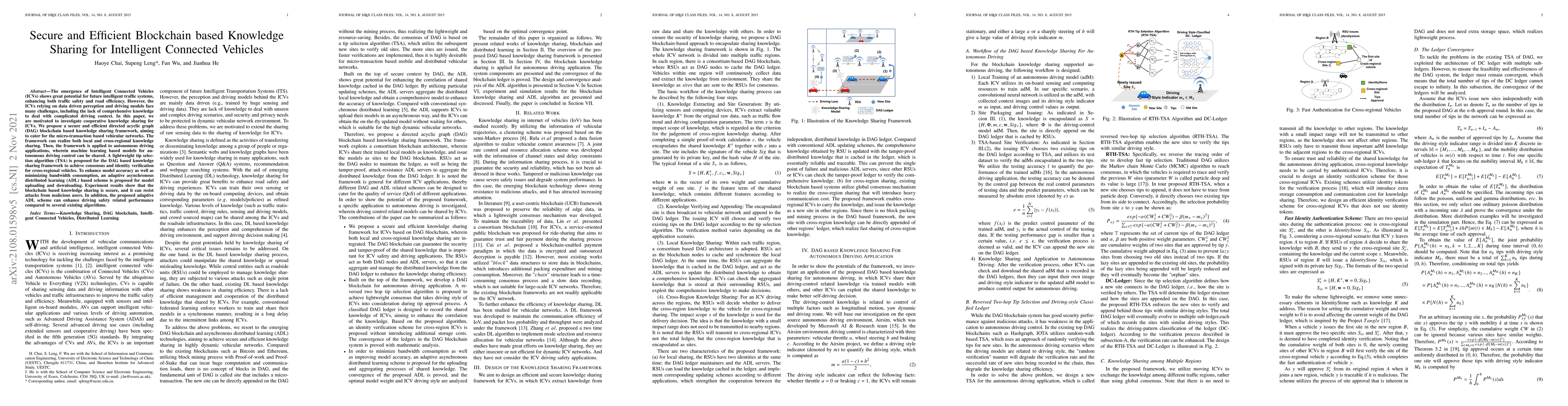 This paper proposes a secure and efficient blockchain-based framework for knowledge sharing among Intelligent Connected Vehicles (ICVs) to enhance traffic safety and efficiency. The framework employs a directed acyclic graph (DAG) blockchain, a lightweight tip selection algorithm, and an adaptive asynchronous distributed learning scheme to achieve secure, efficient, and accurate knowledge sharing and model updates.