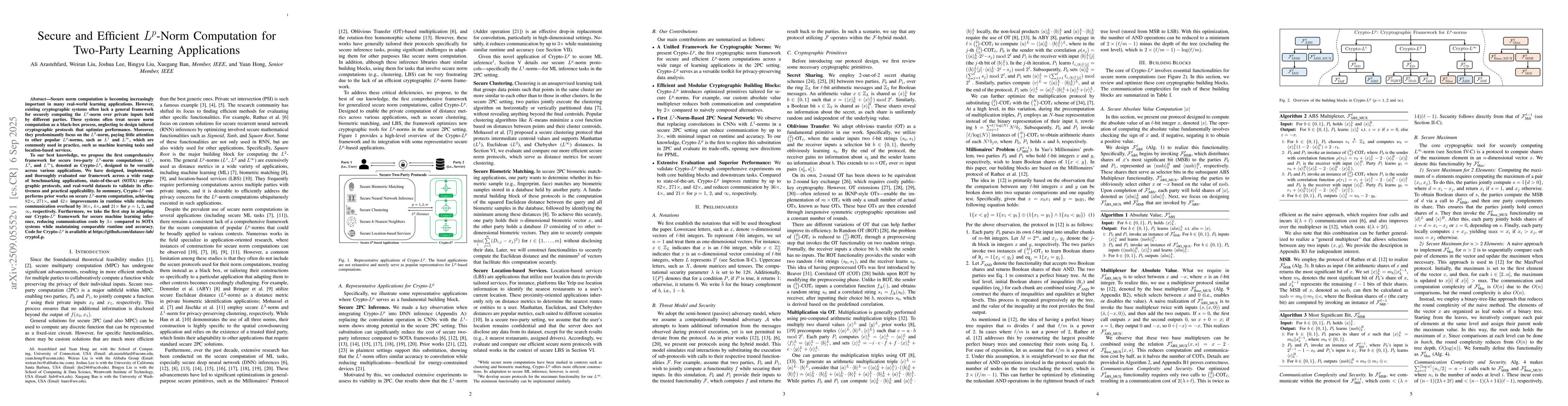 Secure norm computation is becoming increasingly important in many real-world learning applications. However, existing cryptographic systems often lack a general framework for securely computing the $L^p$-norm over private inputs held by different parties. These systems often treat secure norm computation as a black-box process, neglecting to design tailored cryptographic protocols that optimize performance. Moreover, they predominantly focus on the $L^2$-norm, paying little attention to other popular $L^p$-norms, such as $L^1$ and $L^\infty$, which are commonly used in practice, such as machine learning tasks and location-based services. To our best knowledge, we propose the first comprehensive framework for secure two-party $L^p$-norm computations ($L^1$, $L^2$, and $L^\infty$), denoted as \mbox{Crypto-$L^p$}, designed to be versatile across various applications. We have designed, implemented, and thoroughly evaluated our framework across a wide range of benchmarking applications, state-of-the-art (SOTA) cryptographic protocols, and real-world datasets to validate its effectiveness and practical applicability. In summary, \mbox{Crypto-$L^p$} outperforms prior works on secure $L^p$-norm computation, achieving $82\times$, $271\times$, and $42\times$ improvements in runtime while reducing communication overhead by $36\times$, $4\times$, and $21\times$ for $p=1$, $2$, and $\infty$, respectively. Furthermore, we take the first step in adapting our Crypto-$L^p$ framework for secure machine learning inference, reducing communication costs by $3\times$ compared to SOTA systems while maintaining comparable runtime and accuracy.