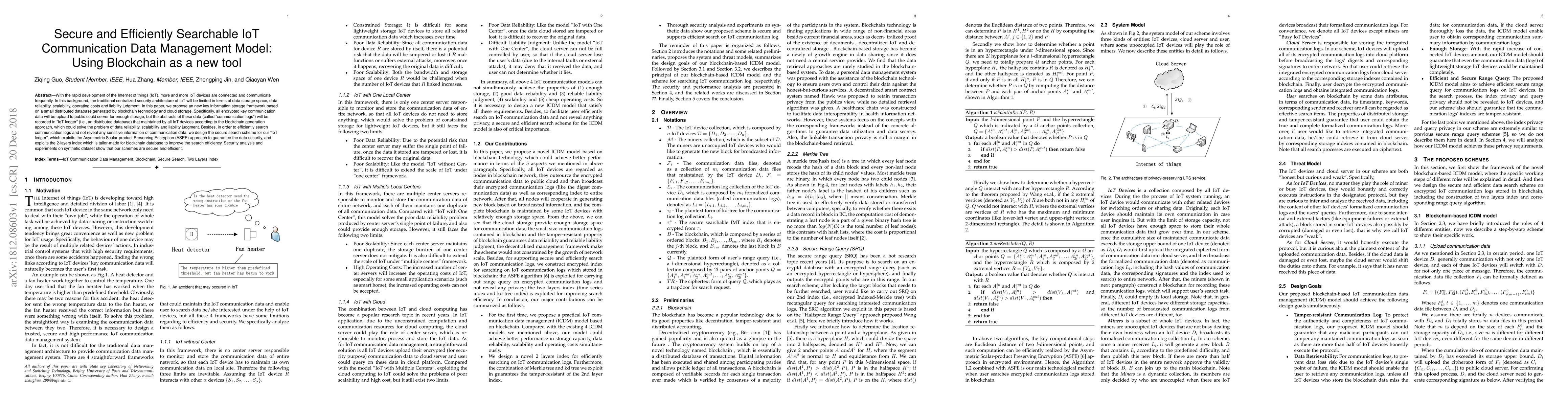 This paper proposes a blockchain-based framework for managing IoT communication data, utilizing a distributed ledger to enhance data reliability and scalability while employing cloud storage for large data volumes. It introduces an efficient search scheme with Asymmetric Scalar-product Preserving Encryption and a tailored 2-layer index to ensure secure and fast data retrieval.
