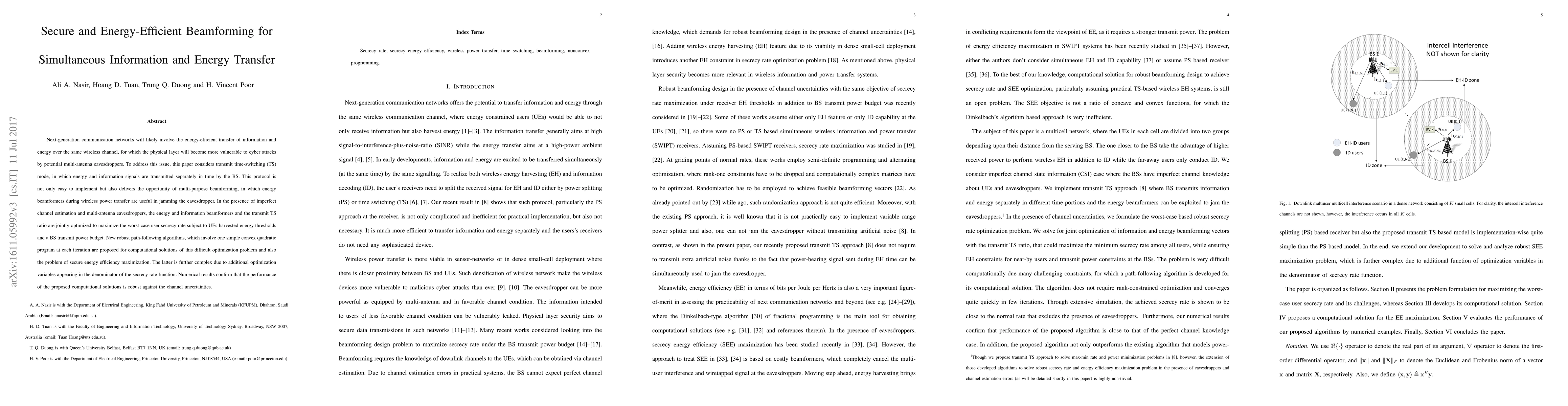 This paper proposes secure and energy-efficient beamforming for simultaneous information and energy transfer in next-generation communication networks, using transmit time-switching to optimize beamformers and the transmit ratio to maximize user secrecy rates while addressing channel imperfections and multi-antenna eavesdroppers. Robust path-following algorithms are developed to solve the complex optimization problem.