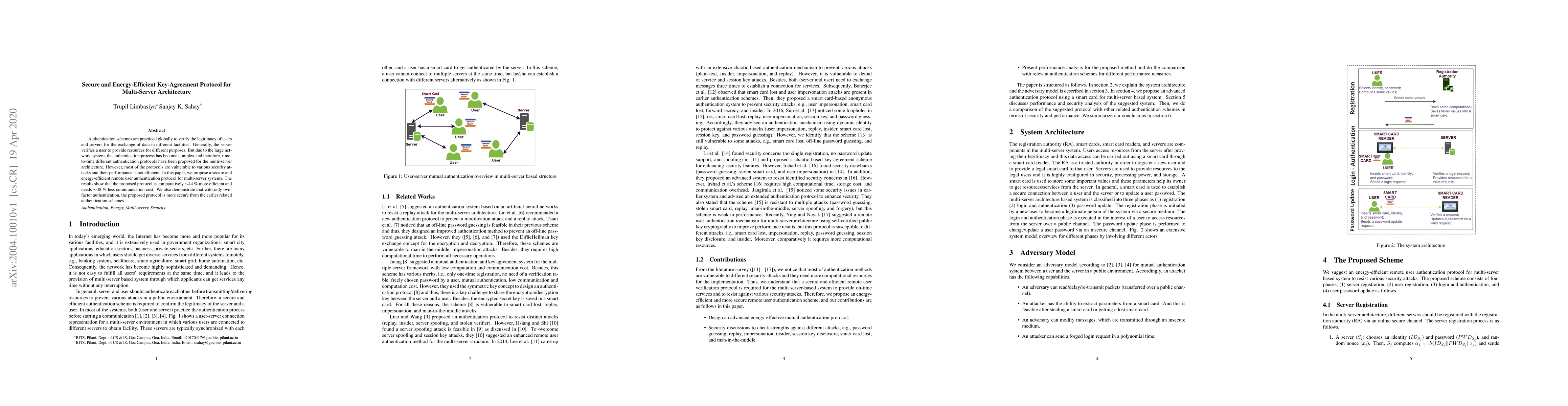 This paper proposes a secure and energy-efficient remote user authentication protocol for multi-server systems, demonstrating improved efficiency and reduced communication costs by ~44% and ~38% respectively, while maintaining high security with only two-factor authentication.