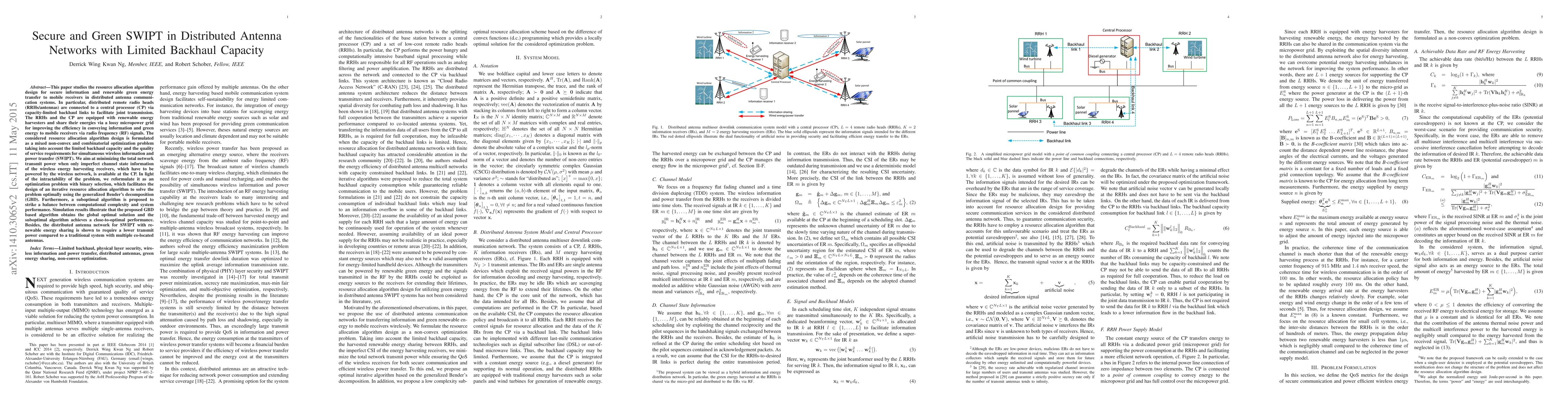 This paper proposes an optimization algorithm for secure and green communication in distributed antenna networks with limited backhaul capacity, focusing on minimizing transmit power for simultaneous wireless information and power transfer (SWIPT) using renewable energy. The optimal generalized Bender's decomposition (GBD) algorithm and a suboptimal approach are developed to address the mixed non-convex and combinatorial optimization problem, demonstrating lower transmit power compared to traditional systems.