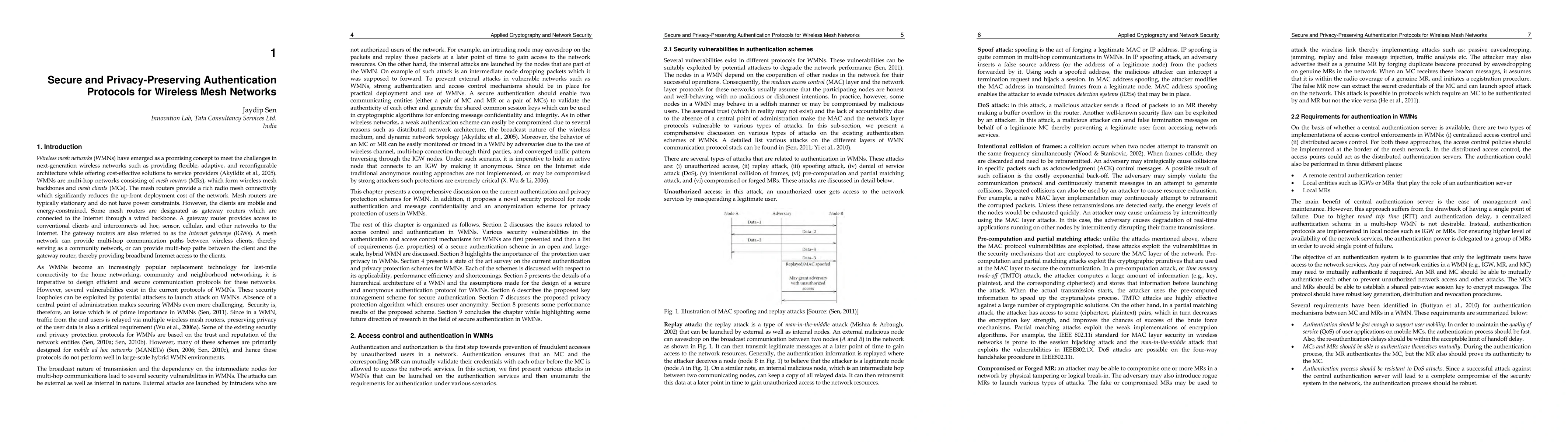 Wireless mesh networks (WMNs) have emerged as a promising concept to meet the challenges in next-generation wireless networks such as providing flexible, adaptive, and reconfigurable architecture while offering cost-effective solutions to service providers. As WMNs become an increasingly popular replacement technology for last-mile connectivity to the home networking, community and neighborhood networking, it is imperative to design efficient and secure communication protocols for these networks. However, several vulnerabilities exist in currently existing protocols for WMNs. These security loopholes can be exploited by potential attackers to launch attack on WMNs. The absence of a central point of administration makes securing WMNs even more challenging. The broadcast nature of transmission and the dependency on the intermediate nodes for multi-hop communications lead to several security vulnerabilities in WMNs. The attacks can be external as well as internal in nature. External attacks are launched by intruders who are not authorized users of the network. For example, an intruding node may eavesdrop on the packets and replay those packets at a later point of time to gain access to the network resources. On the other hand, the internal attacks are launched by the nodes that are part of the WMN. On example of such attack is an intermediate node dropping packets which it was supposed to forward. This chapter presents a comprehensive discussion on the current authentication and privacy protection schemes for WMN. In addition, it proposes a novel security protocol for node authentication and message confidentiality and an anonymization scheme for privacy protection of users in WMNs.