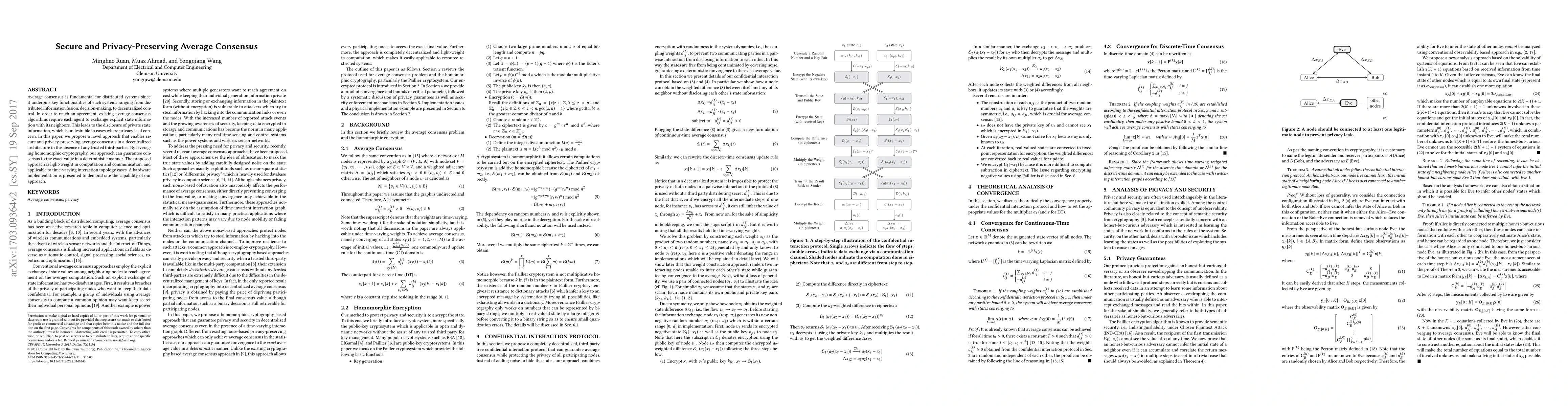 This paper presents a novel method for secure and privacy-preserving average consensus in decentralized systems using homomorphic cryptography, ensuring exact consensus without disclosing private state information, and demonstrating its efficiency through a hardware implementation.