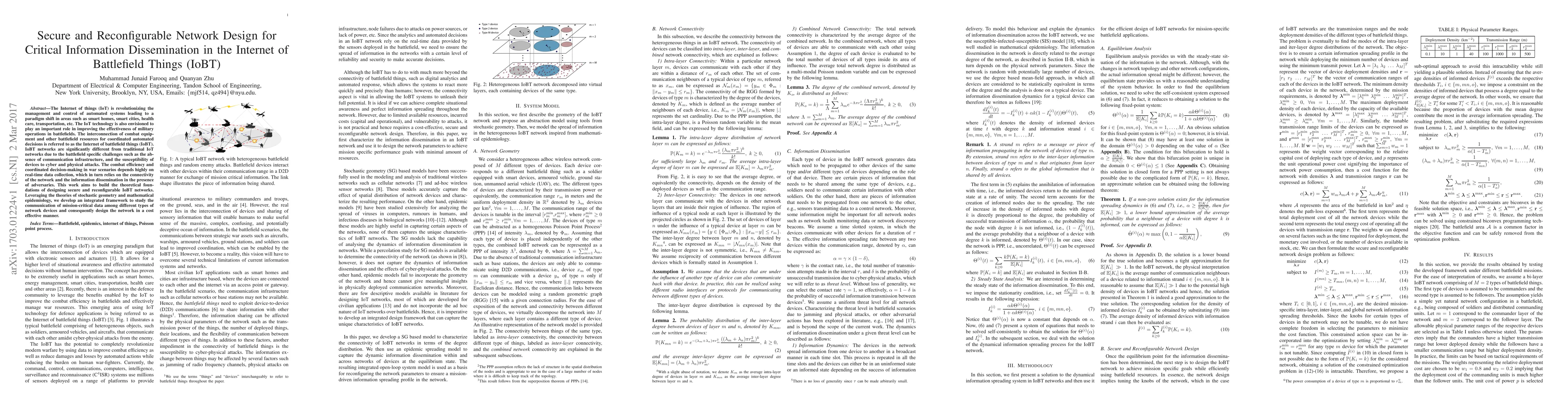 The Internet of things (IoT) is revolutionizing the management and control of automated systems leading to a paradigm shift in areas such as smart homes, smart cities, health care, transportation, etc. The IoT technology is also envisioned to play an important role in improving the effectiveness of military operations in battlefields. The interconnection of combat equipment and other battlefield resources for coordinated automated decisions is referred to as the Internet of battlefield things (IoBT). IoBT networks are significantly different from traditional IoT networks due to the battlefield specific challenges such as the absence of communication infrastructure, and the susceptibility of devices to cyber and physical attacks. The combat efficiency and coordinated decision-making in war scenarios depends highly on real-time data collection, which in turn relies on the connectivity of the network and the information dissemination in the presence of adversaries. This work aims to build the theoretical foundations of designing secure and reconfigurable IoBT networks. Leveraging the theories of stochastic geometry and mathematical epidemiology, we develop an integrated framework to study the communication of mission-critical data among different types of network devices and consequently design the network in a cost effective manner.