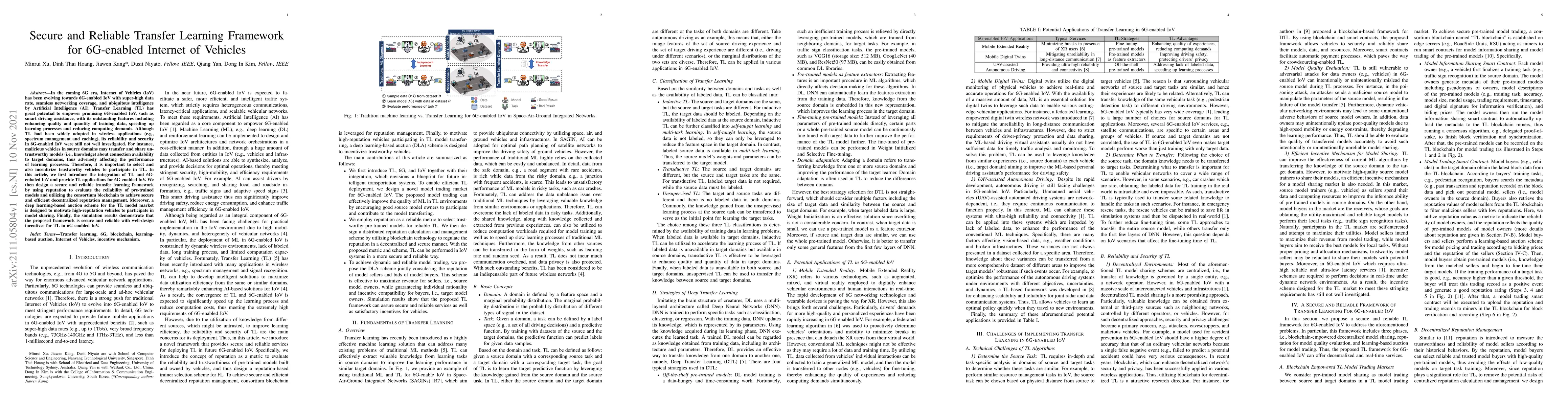 The paper presents a secure and reliable transfer learning framework for 6G-enabled IoV, incorporating blockchain-empowered decentralized model sharing, reputation-based model quality evaluation, and a deep learning-based auction scheme for model trading.