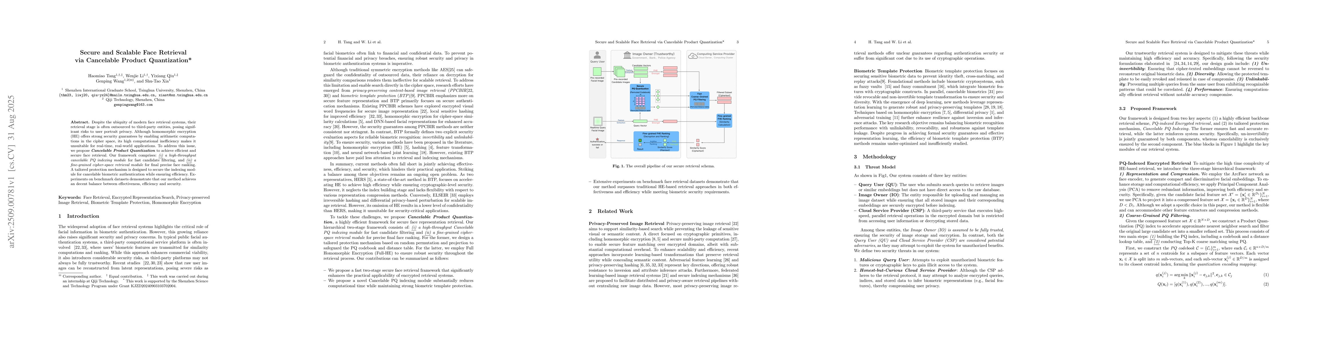 Despite the ubiquity of modern face retrieval systems, their retrieval stage is often outsourced to third-party entities, posing significant risks to user portrait privacy. Although homomorphic encryption (HE) offers strong security guarantees by enabling arithmetic computations in the cipher space, its high computational inefficiency makes it unsuitable for real-time, real-world applications. To address this issue, we propose Cancelable Product Quantization, a highly efficient framework for secure face representation retrieval. Our hierarchical two-stage framework comprises: (i) a high-throughput cancelable PQ indexing module for fast candidate filtering, and (ii) a fine-grained cipher-space retrieval module for final precise face ranking. A tailored protection mechanism is designed to secure the indexing module for cancelable biometric authentication while ensuring efficiency. Experiments on benchmark datasets demonstrate that our method achieves an decent balance between effectiveness, efficiency and security.