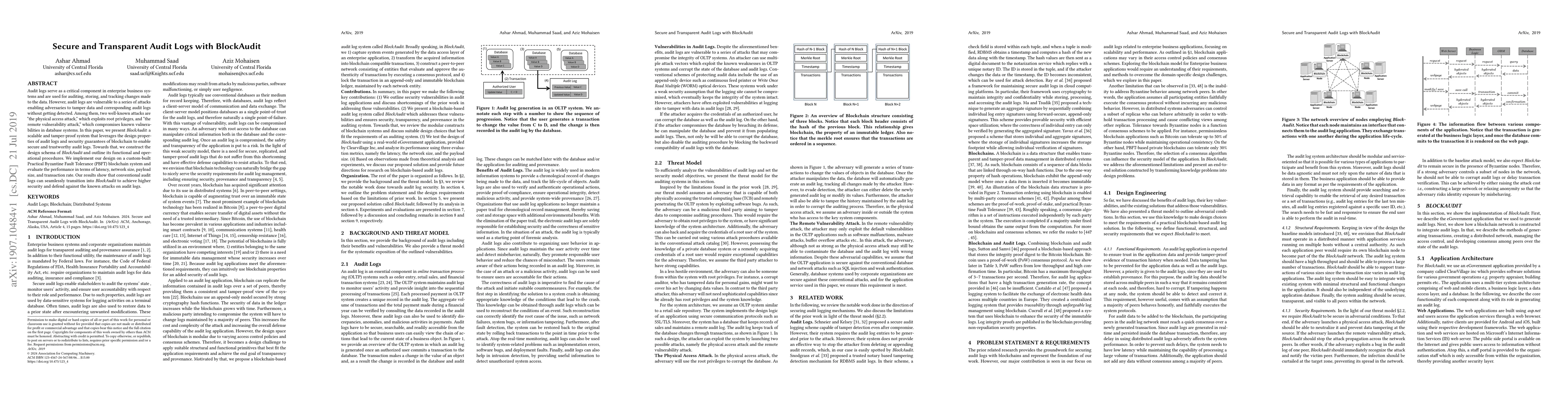 BlockAudit presents a scalable, tamper-proof system for secure audit logs using blockchain technology to defend against physical access and remote vulnerability attacks. The implementation on a custom PBFT blockchain demonstrates improved security and performance over conventional audit logs.