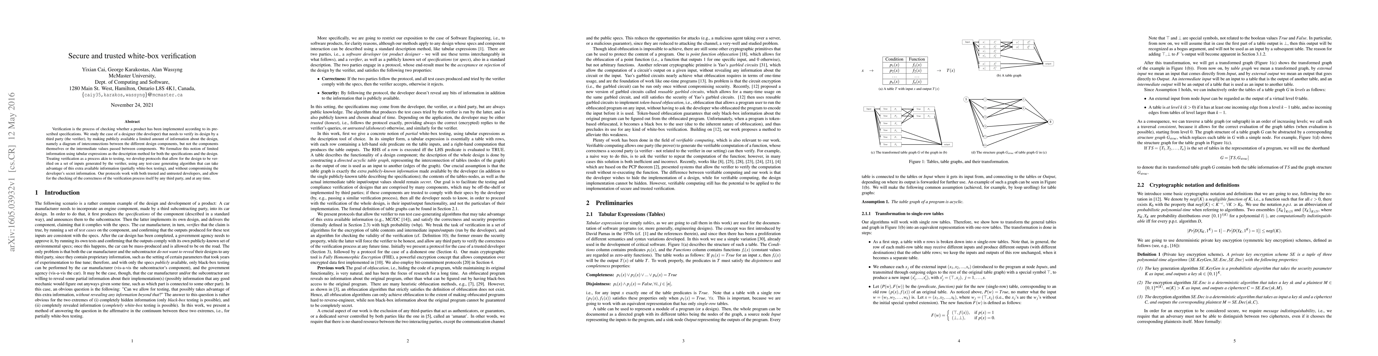 Verification is the process of checking whether a product has been implemented according to its prescribed specifications. We study the case of a designer (the developer) that needs to verify its design by a third party (the verifier), by making publicly available a limited amount of information about the design, namely a diagram of interconnections between the different design components, but not the components themselves or the intermediate values passed between components. We formalize this notion of limited information using tabular expressions as the description method for both the specifications and the design. Treating verification as a process akin to testing, we develop protocols that allow for the design to be verified on a set of inputs generated by the verifier, using any test-case generating algorithm that can take advantage of this extra available information (partially white-box testing), and without compromising the developer's secret information. Our protocols work with both trusted and untrusted developers, and allow for the checking of the correctness of the verification process itself by any third party, and at any time.
