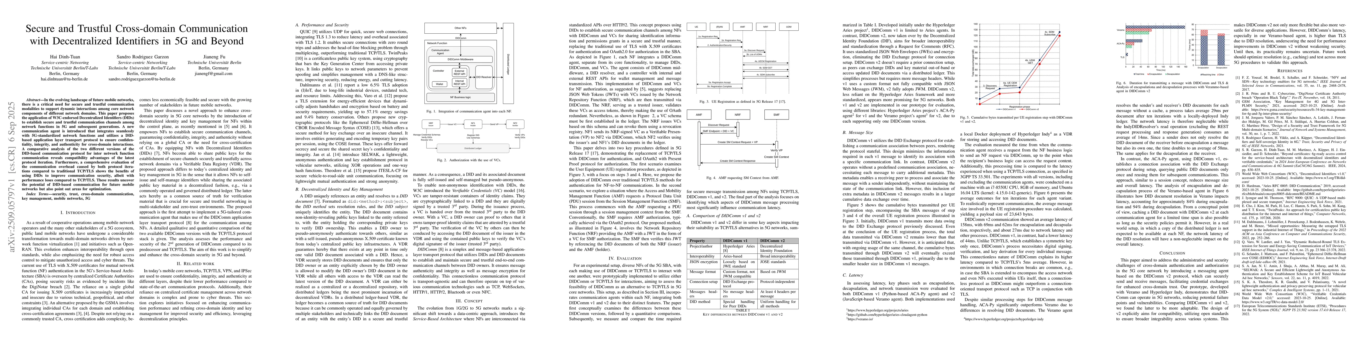 In the evolving landscape of future mobile networks, there is a critical need for secure and trustful communication modalities to support dynamic interactions among core network components of different network domains. This paper proposes the application of W3C-endorsed Decentralized Identifiers (DIDs) to establish secure and trustful communication channels among network functions in 5G and subsequent generations. A new communication agent is introduced that integrates seamlessly with 5G-standardized network functions and utilizes a DID-based application layer transport protocol to ensure confidentiality, integrity, and authenticity for cross-domain interactions. A comparative analysis of the two different versions of the DID-based communication protocol for inter network function communication reveals compatibility advantages of the latest protocol iteration. Furthermore, a comprehensive evaluation of the communication overhead caused by both protocol iterations compared to traditional TCP/TLS shows the benefits of using DIDs to improve communication security, albeit with performance loses compared to TCP/TLS. These results uncover the potential of DID-based communication for future mobile networks but also point out areas for optimization.