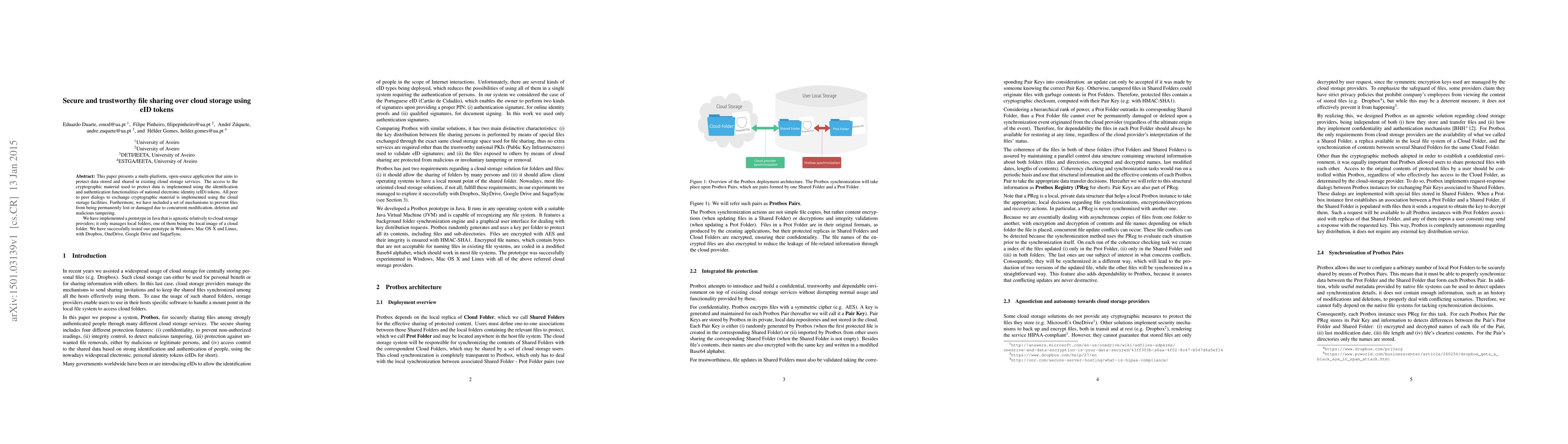 This paper introduces an open-source, multi-platform application for secure file sharing in cloud storage, leveraging national eID tokens for authentication and employing cloud storage for cryptographic material exchange. The prototype, tested on various operating systems and cloud services, includes mechanisms to prevent file corruption from concurrent modifications.