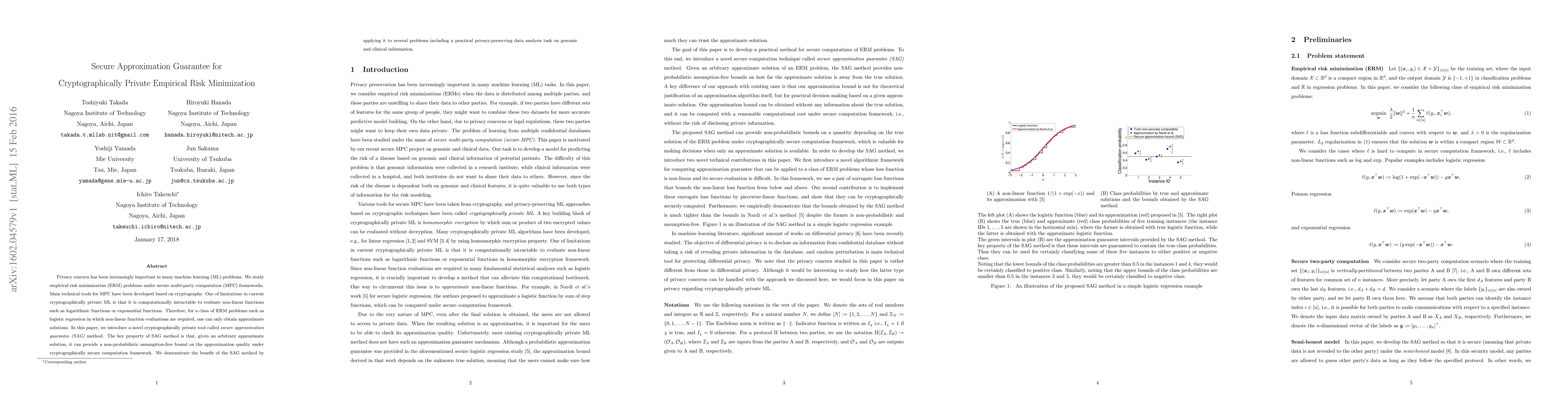 Privacy concern has been increasingly important in many machine learning (ML) problems. We study empirical risk minimization (ERM) problems under secure multi-party computation (MPC) frameworks. Main technical tools for MPC have been developed based on cryptography. One of limitations in current cryptographically private ML is that it is computationally intractable to evaluate non-linear functions such as logarithmic functions or exponential functions. Therefore, for a class of ERM problems such as logistic regression in which non-linear function evaluations are required, one can only obtain approximate solutions. In this paper, we introduce a novel cryptographically private tool called secure approximation guarantee (SAG) method. The key property of SAG method is that, given an arbitrary approximate solution, it can provide a non-probabilistic assumption-free bound on the approximation quality under cryptographically secure computation framework. We demonstrate the benefit of the SAG method by applying it to several problems including a practical privacy-preserving data analysis task on genomic and clinical information.