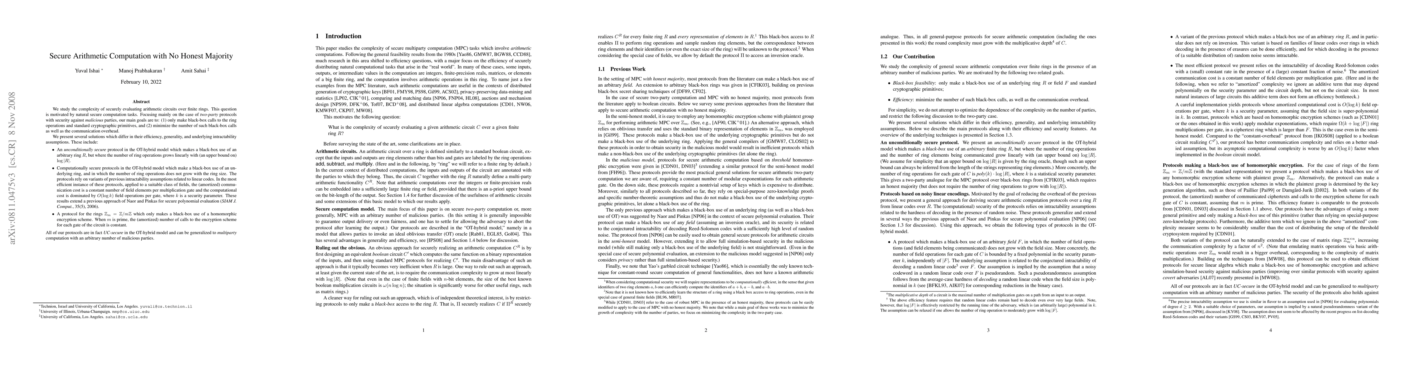 Researchers developed protocols for securely computing arithmetic circuits over finite rings with minimal black-box calls and communication overhead, including unconditional security and computationally secure options.