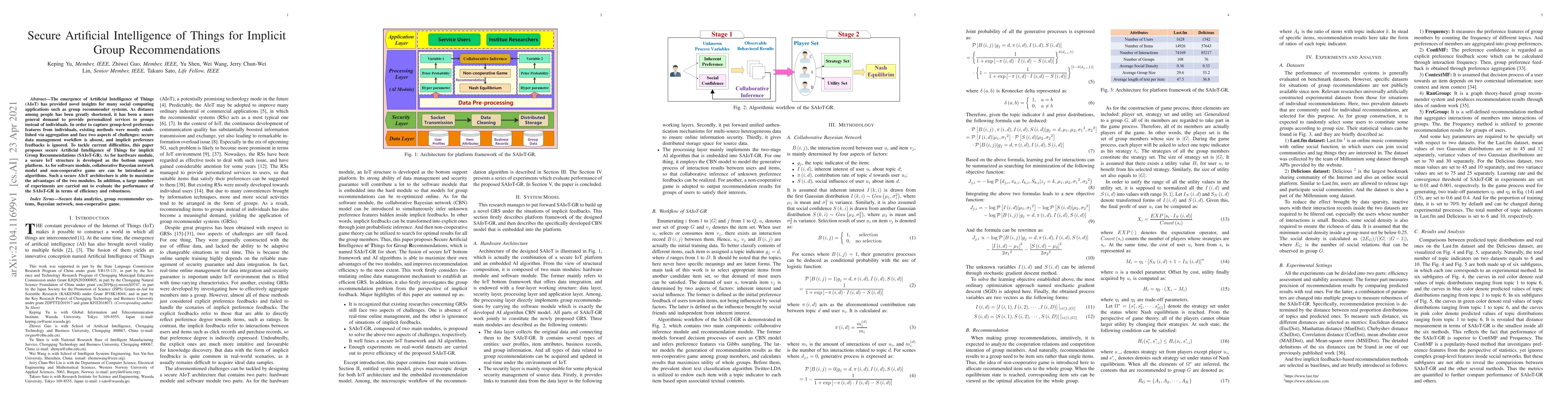 The emergence of Artificial Intelligence of Things (AIoT) has provided novel insights for many social computing applications such as group recommender systems. As distance among people has been greatly shortened, it has been a more general demand to provide personalized services to groups instead of individuals. In order to capture group-level preference features from individuals, existing methods were mostly established via aggregation and face two aspects of challenges: secure data management workflow is absent, and implicit preference feedbacks is ignored. To tackle current difficulties, this paper proposes secure Artificial Intelligence of Things for implicit Group Recommendations (SAIoT-GR). As for hardware module, a secure IoT structure is developed as the bottom support platform. As for software module, collaborative Bayesian network model and non-cooperative game are can be introduced as algorithms. Such a secure AIoT architecture is able to maximize the advantages of the two modules. In addition, a large number of experiments are carried out to evaluate the performance of the SAIoT-GR in terms of efficiency and robustness.