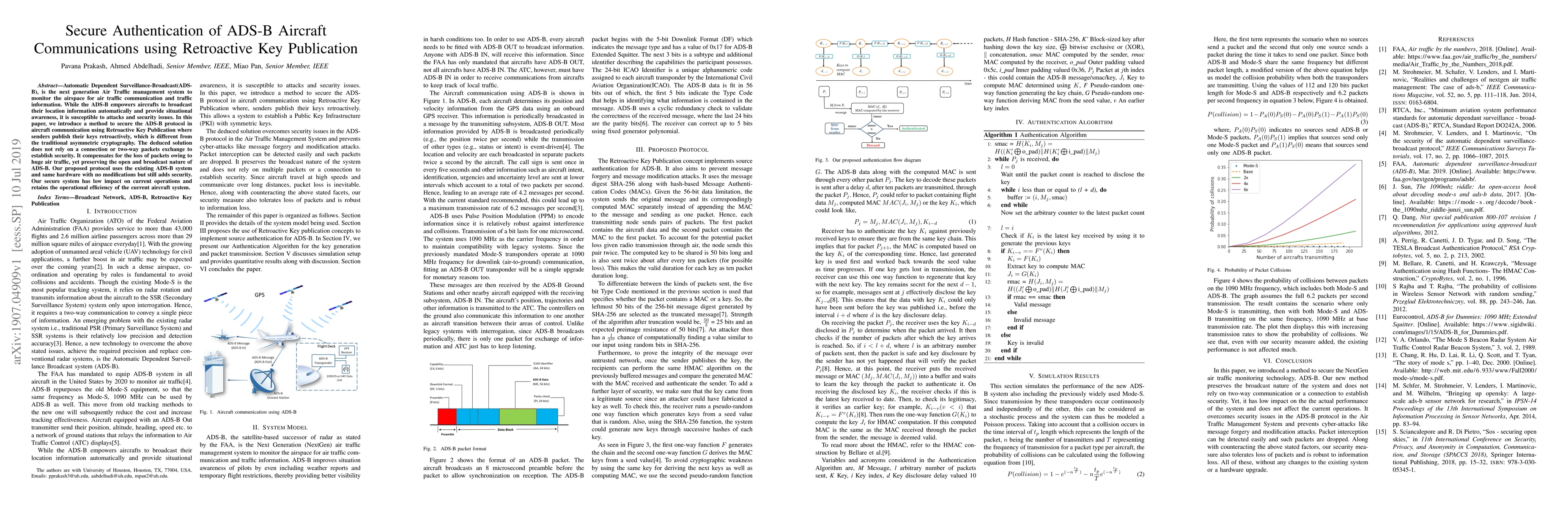 This research introduces a secure authentication method for ADS-B aircraft communications using Retroactive Key Publication. It maintains current system efficiency, requires no hardware modifications, and ensures security without compromising the open, broadcast nature of ADS-B.