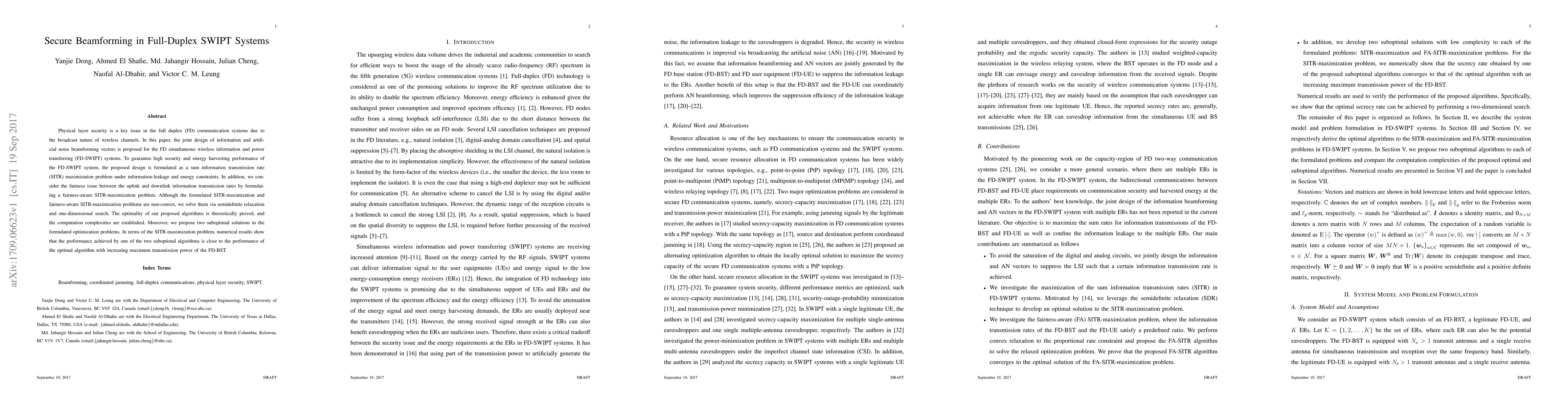 This paper proposes a joint design of information and artificial noise beamforming vectors for secure full-duplex SWIPT systems, aiming to maximize sum information transmission rate under security and energy constraints. The authors solve non-convex optimization problems via semidefinite relaxation and provide suboptimal solutions, demonstrating near-optimal performance through numerical results.