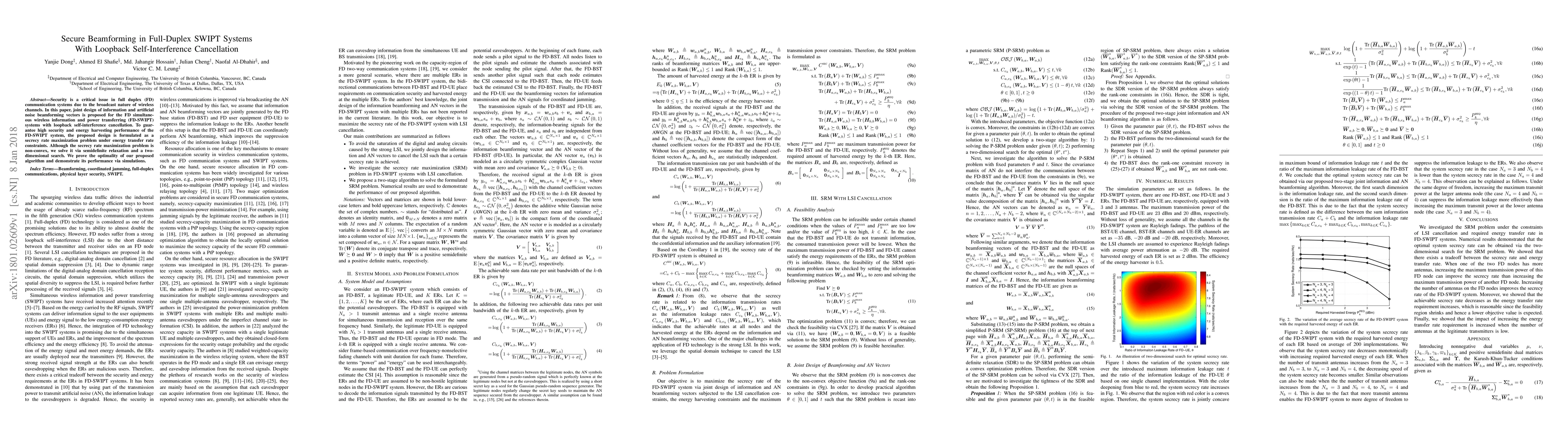 This paper proposes a secure beamforming design for full-duplex SWIPT systems using loopback self-interference cancellation, aiming to maximize secrecy rate while ensuring energy transfer efficiency. The non-convex optimization problem is solved via semidefinite relaxation and a two-dimensional search, with proven optimality and demonstrated performance through simulations.