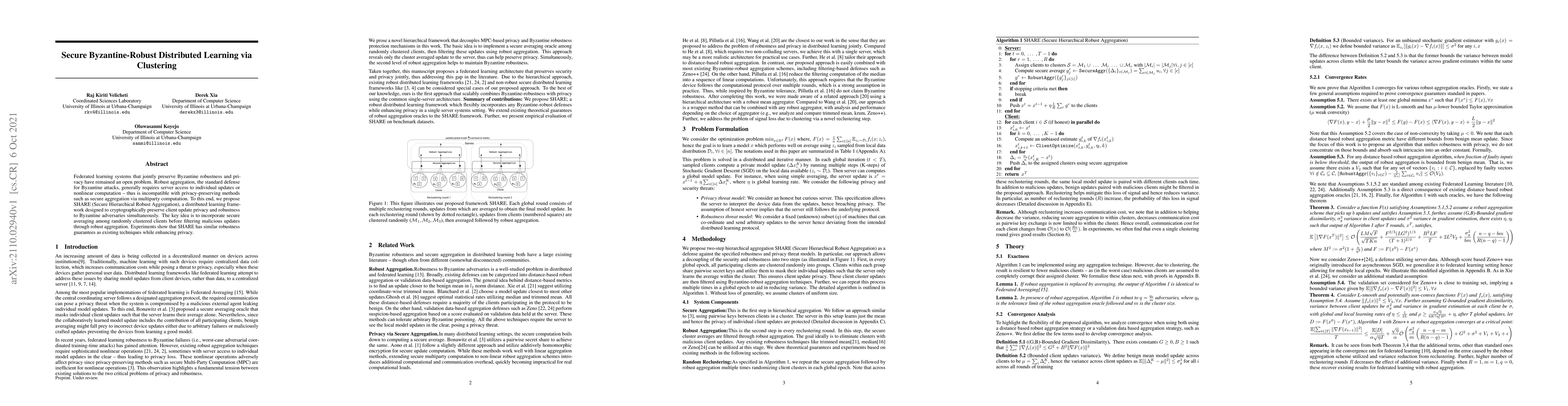 This paper proposes SHARE, a distributed learning framework that achieves both Byzantine robustness and privacy in federated learning. It uses secure averaging among clustered clients and robust aggregation to filter malicious updates while preserving client update privacy.