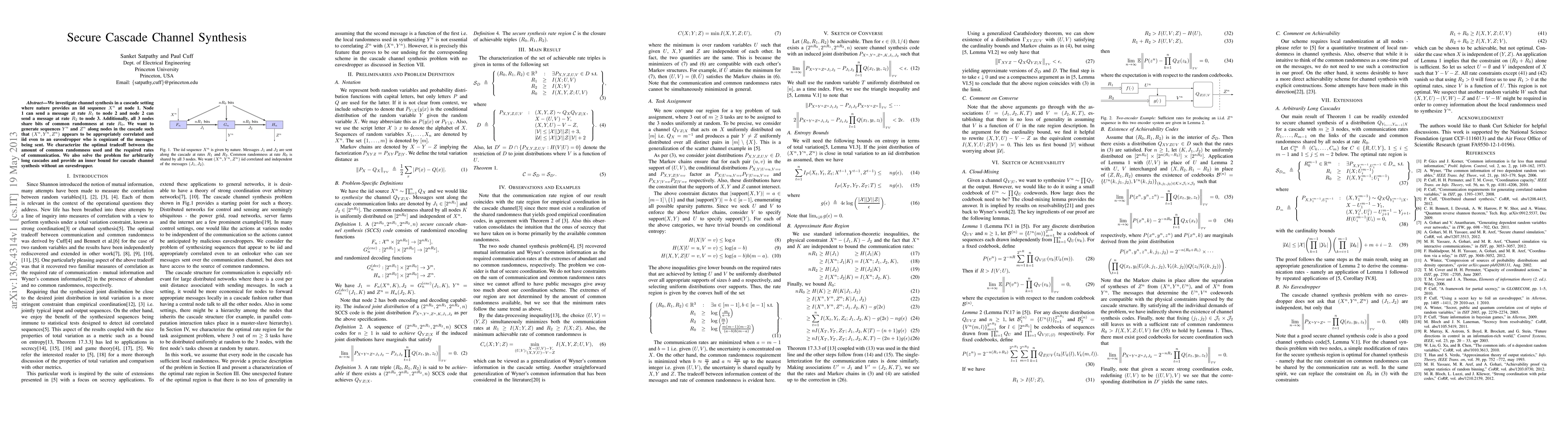 The paper investigates channel synthesis in a cascade setting where nodes communicate sequentially with shared randomness, characterizing the optimal tradeoff between common randomness used and required communication rates.