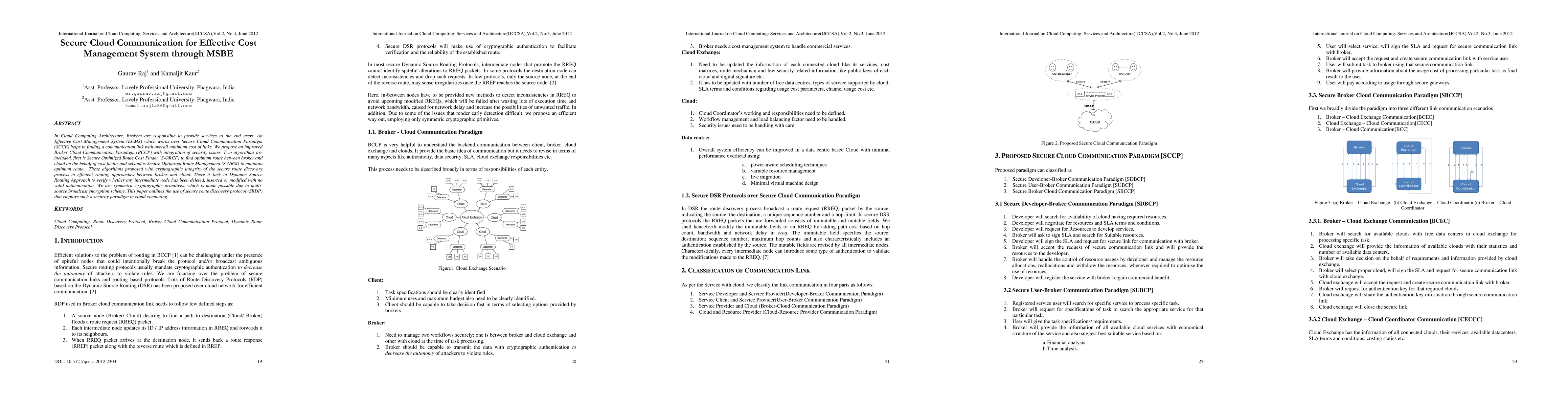 In Cloud Computing Architecture, Brokers are responsible to provide services to the end users. An Effective Cost Management System (ECMS) which works over Secure Cloud Communication Paradigm (SCCP) helps in finding a communication link with overall minimum cost of links. We propose an improved Broker Cloud Communication Paradigm (BCCP) with integration of security issues. Two algorithms are included, first is Secure Optimized Route Cost Finder (S-ORCF) to find optimum route between broker and cloud on the behalf of cost factor and second is Secure Optimized Route Management (S-ORM) to maintain optimum route. These algorithms proposed with cryptographic integrity of the secure route discovery process in efficient routing approaches between broker and cloud. There is lack in Dynamic Source Routing Approach to verify whether any intermediate node has been deleted, inserted or modified with no valid authentication. We use symmetric cryptographic primitives, which is made possible due to multisource broadcast encryption scheme. This paper outlines the use of secure route discovery protocol (SRDP)that employs such a security paradigm in cloud computing.