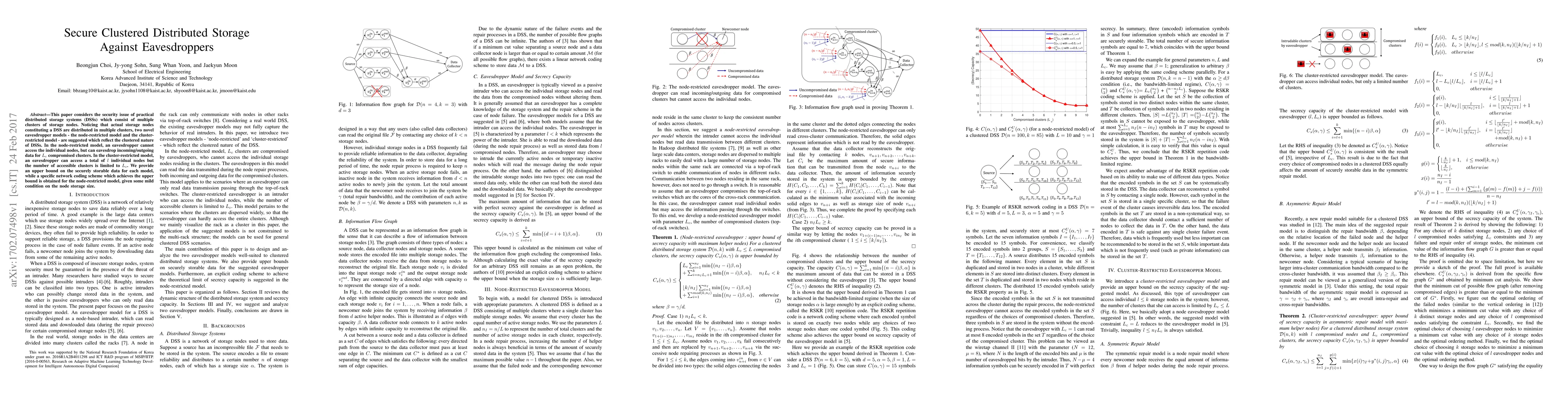 This research is significant as it addresses the security issue in practical DSSs, which are often clustered in real-world applications. By proposing new eavesdropper models and providing upper bounds and coding schemes, the work contributes to the design and analysis of secure distributed storage systems.