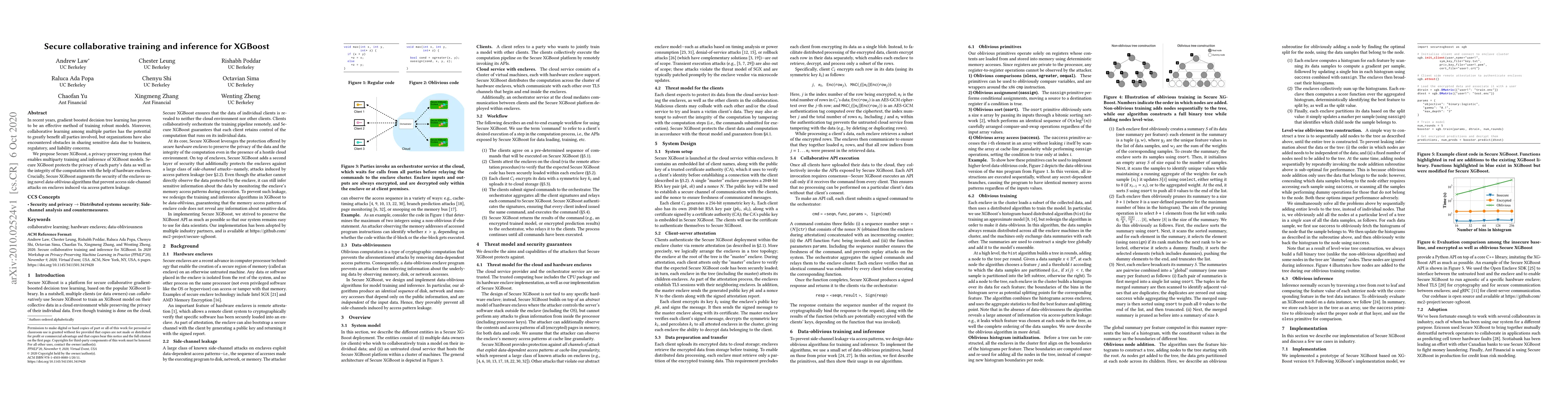 This paper proposes Secure XGBoost, a system for privacy-preserving multiparty training and inference of XGBoost models using hardware enclaves and novel data-oblivious algorithms to protect against access pattern leakage and side-channel attacks.