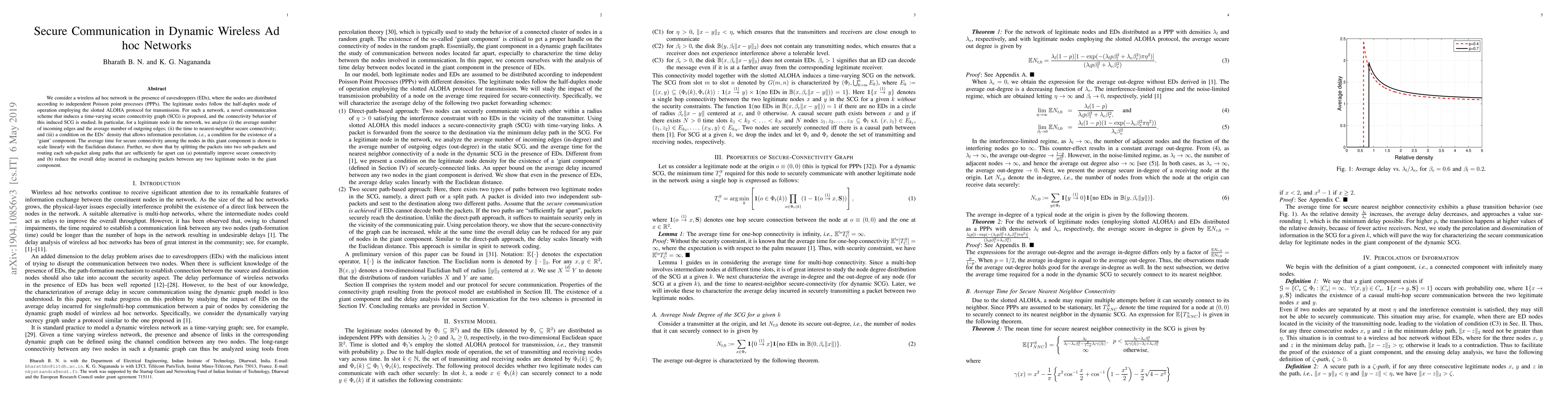 This paper proposes a novel communication scheme for secure wireless ad hoc networks, analyzing the induced time-varying secure connectivity graph. It examines the average connectivity metrics and conditions for information percolation, demonstrating that splitting packets and routing them along distant paths can enhance secure connectivity and reduce overall delay.