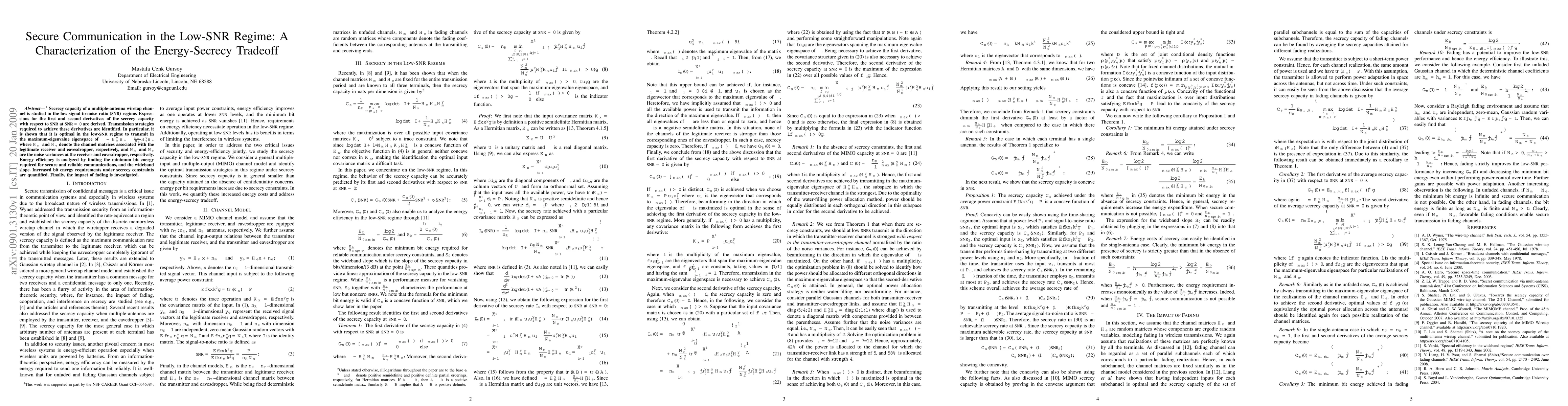 The research analyzes the secrecy capacity of a multiple-antenna wiretap channel in the low-SNR regime, deriving expressions for the first and second derivatives of secrecy capacity with respect to SNR at SNR = 0.